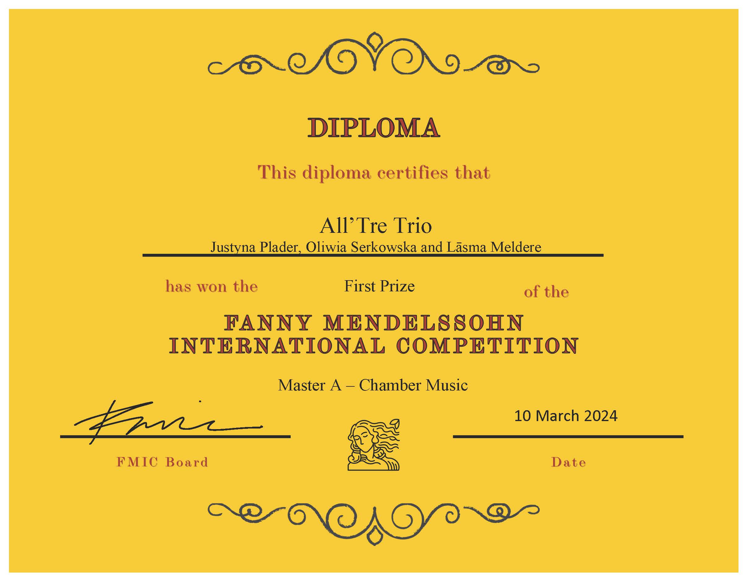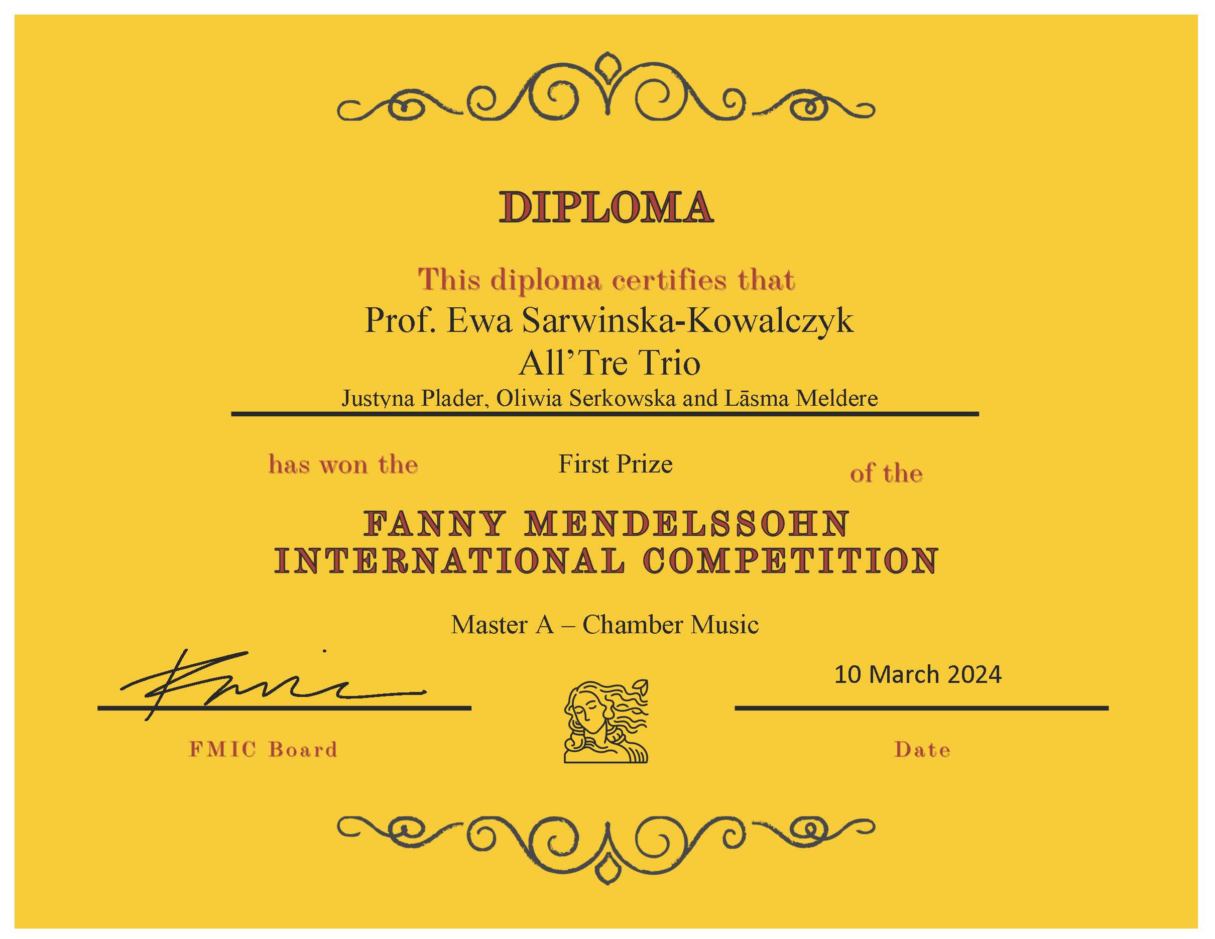 Zespół all'TRE Trio w składzie: Justyna Pląder (III rok studiów I st.) – skrzypce, Oliwia Serkowska (I rok studiów II st.) – wiolonczela, Lāsma Monika Meldere (I rok studiów II st.) – fortepian, z klasy kameralistyki dr Ewy Sarwińskiej-Kowalczyk, dr Pauli Preuss i prof. Sebastiana Hamanna zdobył I NAGRODĘ w kat. Master A – Chamber Music na Fanny Mendelssohn International Competition w Belgii (10.03.2024).