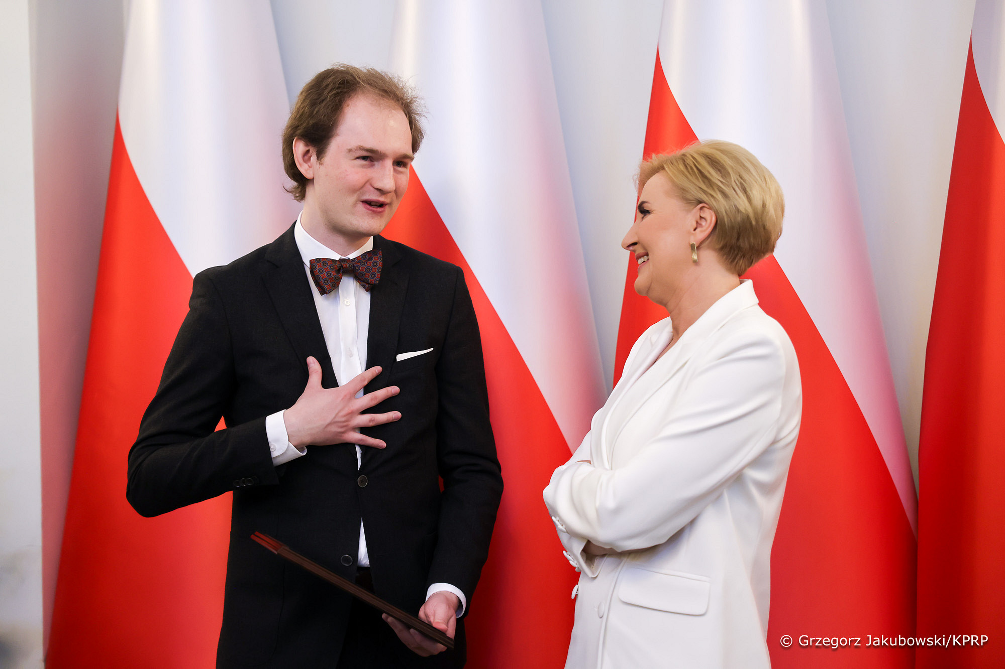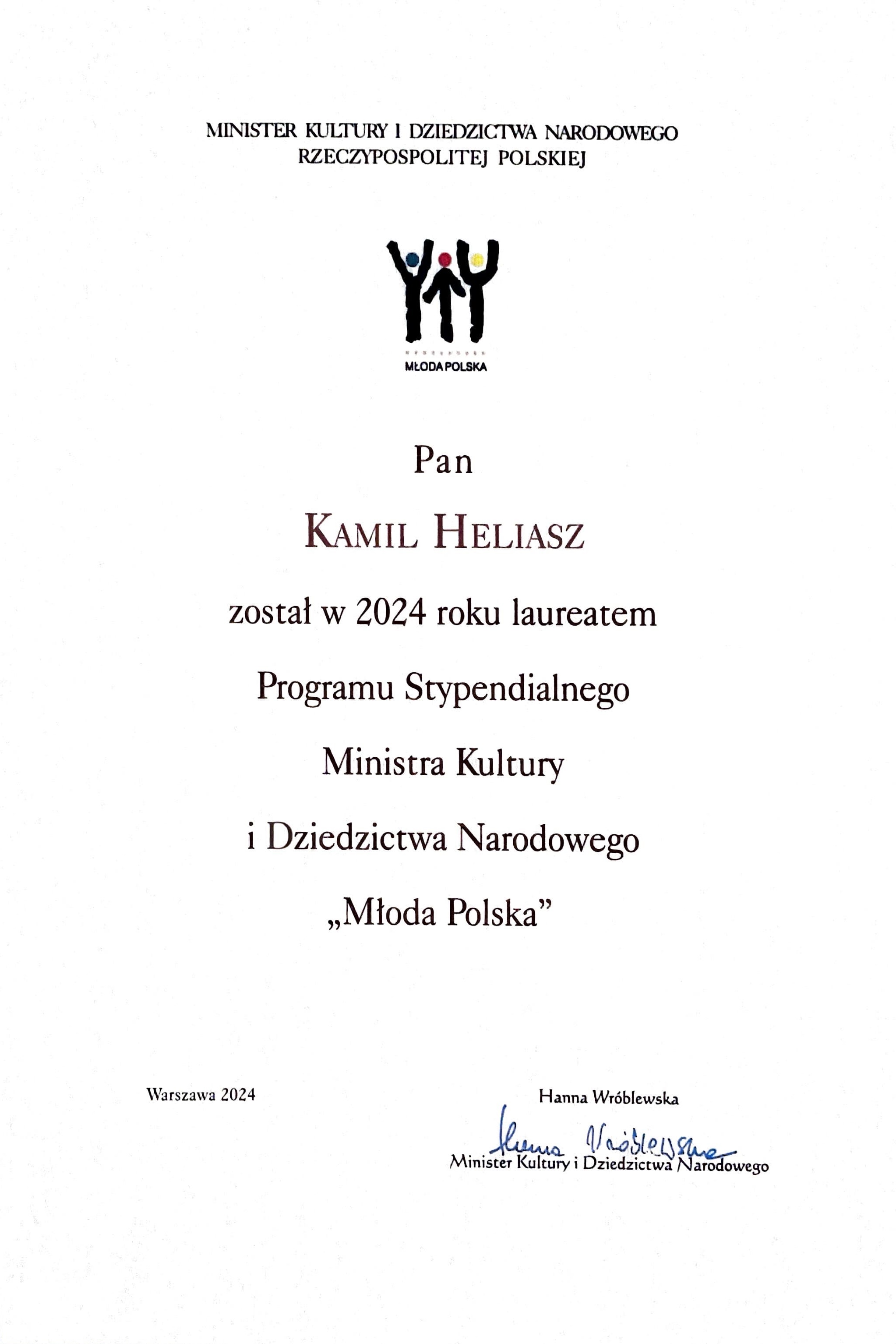 Kamil Heliasz (I rok studiów I st.) z klasy akordeonu prof. dra hab. Krzysztofa Olczaka oraz dra hab. Pawła Zagańczyka został LAUREATEM XXI edycji Programu Stypendialnego Ministra Kultury i Dziedzictwa Narodowego „Młoda Polska” 2024. Celem stypendium jest zakup akordeonu koncertowego. Wręczenie dyplomów przez Hannę Wróblewską, Ministrę Kultury i Dziedzictwa Narodowego, odbyło się podczas uroczystej gali w Sali Wielkiej Zamku Królewskiego w Warszawie w dniu 12.06.2024 r. Organizatorem konkursu jest Minister Kultury i Dziedzictwa Narodowego, w imieniu którego czynności związane z konkursem prowadzi Narodowe Centrum Kultury.