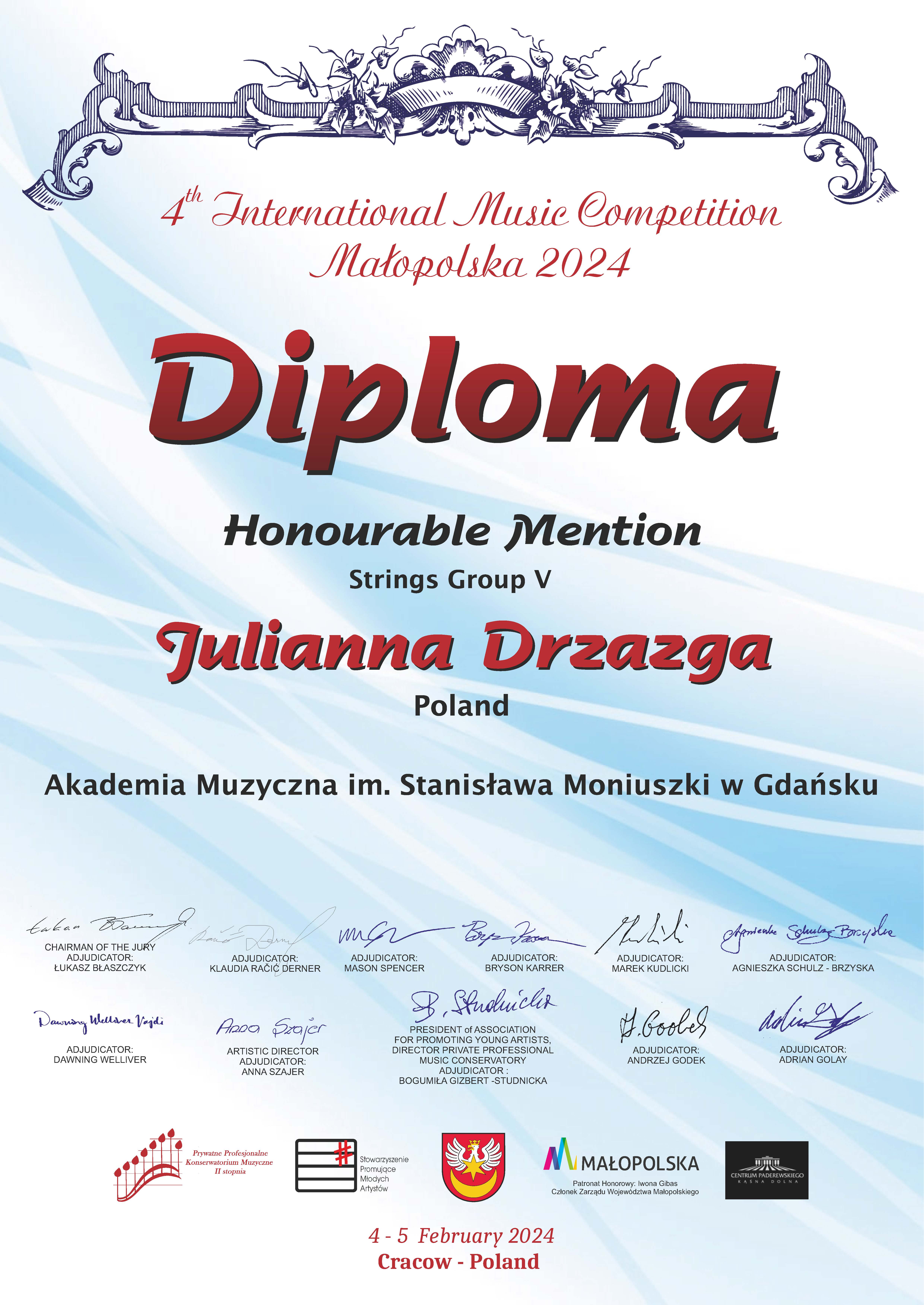 Julianna Drzazga (III rok studiów I st.) z klasy skrzypiec prof. dra hab. Macieja Sobczaka otrzymała WYRÓŻNIENIE w kat. V smyczki na 4th International Music Competition Małopolska 2024 Online w Krakowie (4–5.02.2024).