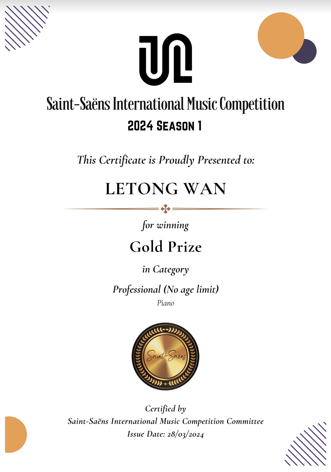 Letong Wan (II rok studiów II st.) z klasy fortepianu dra Macieja Gańskiego zdobyła GOLD PRIZE w kat. Professional (bez limitu wieku) na Saint-Saëns International Music Competition 2024 (28.03.2024). Konkurs odbył się w formule online.