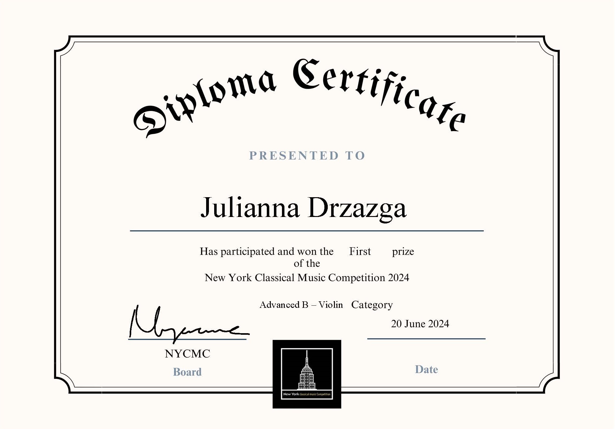 Julianna Drzazga (III rok studiów I st.) z klasy skrzypiec prof. dra hab. Macieja Sobczaka zdobyła I NAGRODĘ w kat. Advanced B – Violin na New York Classical Music Competition 2024 (20.06.2024).
