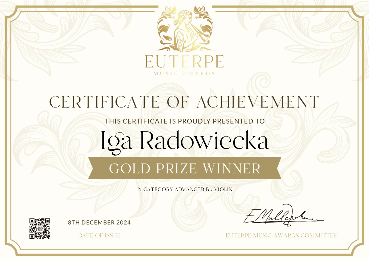 Iga Radowiecka (I rok studiów I st.) z klasy skrzypiec prof. dr hab. Małgorzaty Skorupy zdobyła GOLD PRIZE w kat. Advanced B – Violin w Euterpe Music Awards online w Niemczech (8.12.2024).