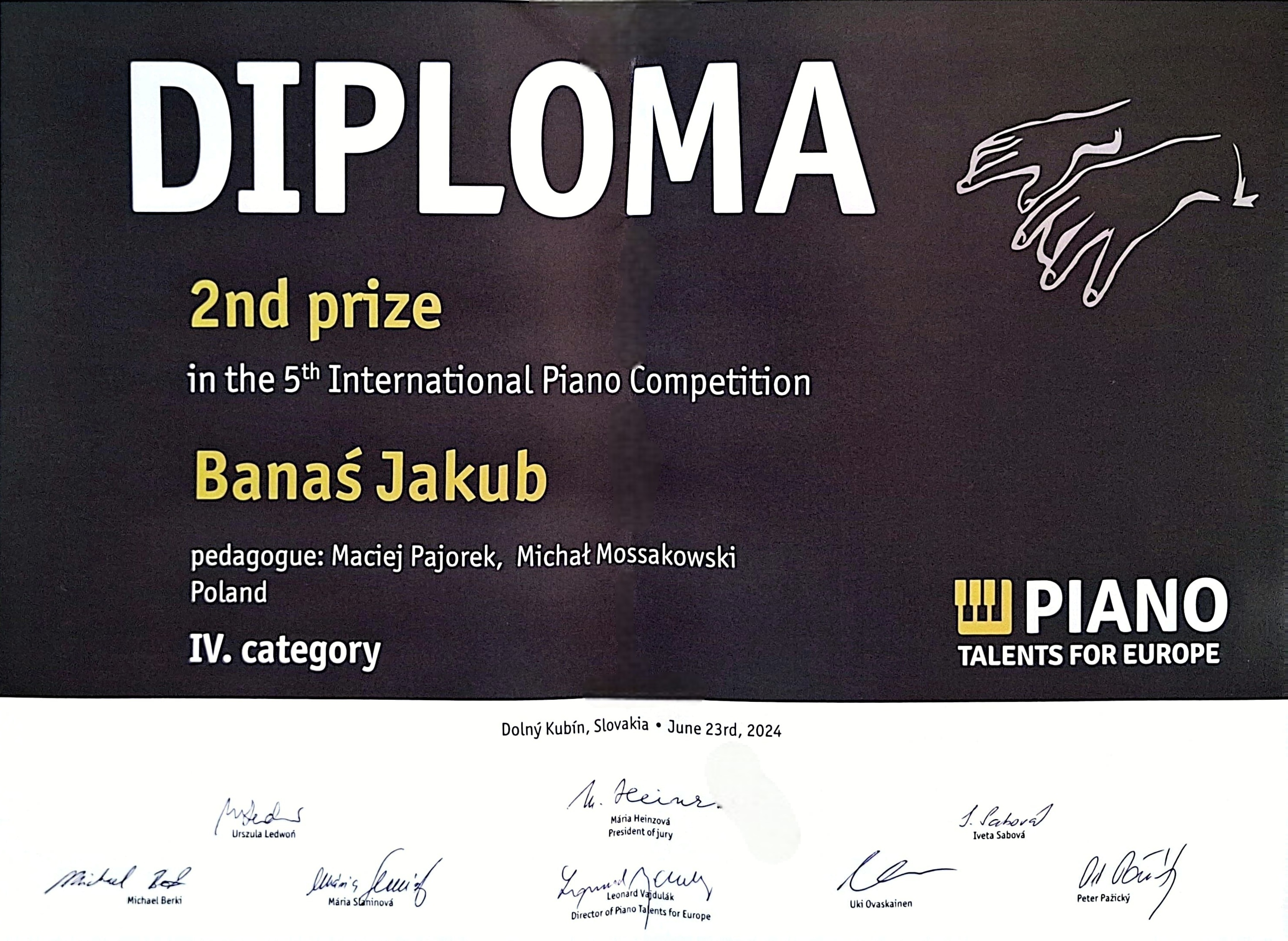 Jakub Banaś (I rok studiów I st.) z klasy fortepianu dra Michała Mossakowskiego zdobył II NAGRODĘ w kat. IV na 5th International Piano Competition PIANO TALENTS FOR EUROPE / V Międzynarodowym Konkursie Pianistycznym PIANO TALENTS FOR EUROPE w Dolným Kubínie/Słowacja (22-23.06.2024).