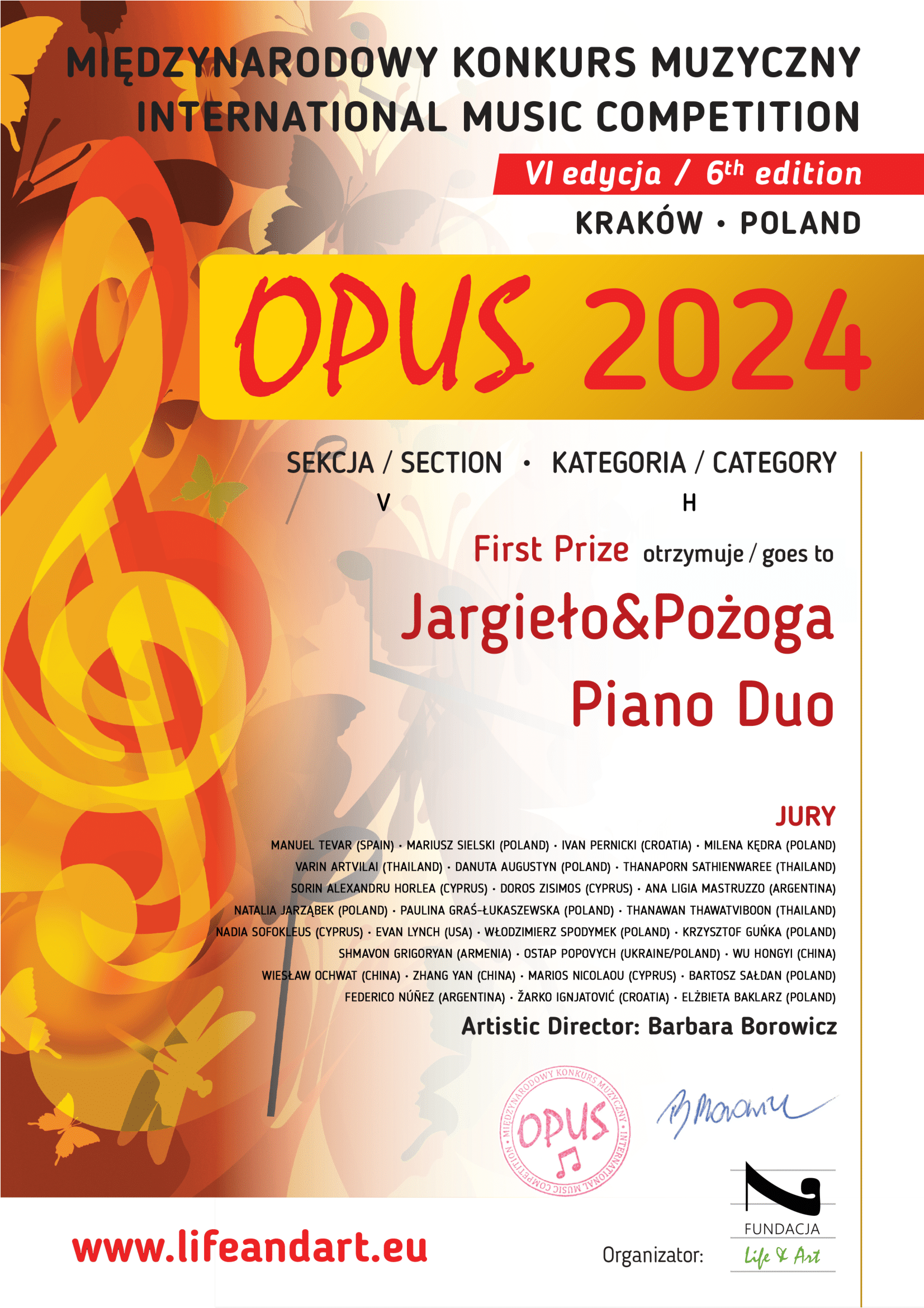 Jargieło&Pożoga Piano Duo w składzie: Zuzanna Jargieło (I rok studiów II st.) i Izabela Pożoga (III rok studiów I st.) z klasy kameralistyki dr Mirosławy Sumlińskiej zdobyło I NAGRODĘ w sekcji V, kat. H podczas VI edycji Międzynarodowego Konkursu Muzycznego „OPUS 2024” (formuła online) w Krakowie (20.05.2024).