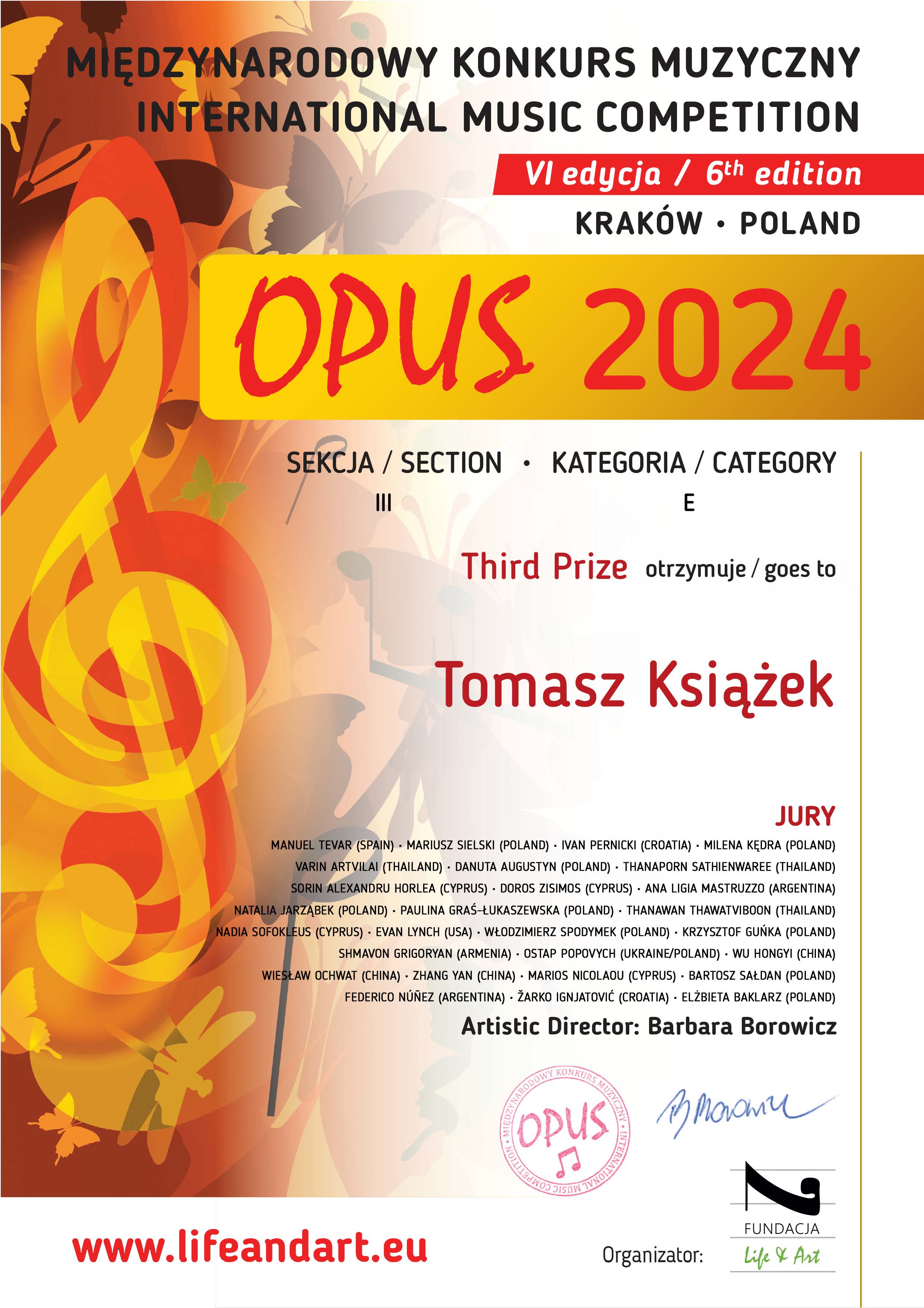 Tomasz Książek (III rok studiów I st.) z klasy waltorni dra hab. Piotra Pożakowskiego zdobył III MIEJSCE w sekcji III, kat. E podczas VI edycji Międzynarodowego Konkursu Muzycznego „OPUS 2024” (formuła online) w Krakowie (20.05.2024). Przy fortepianie towarzyszył studentowi mgr Patryk Morgaś.