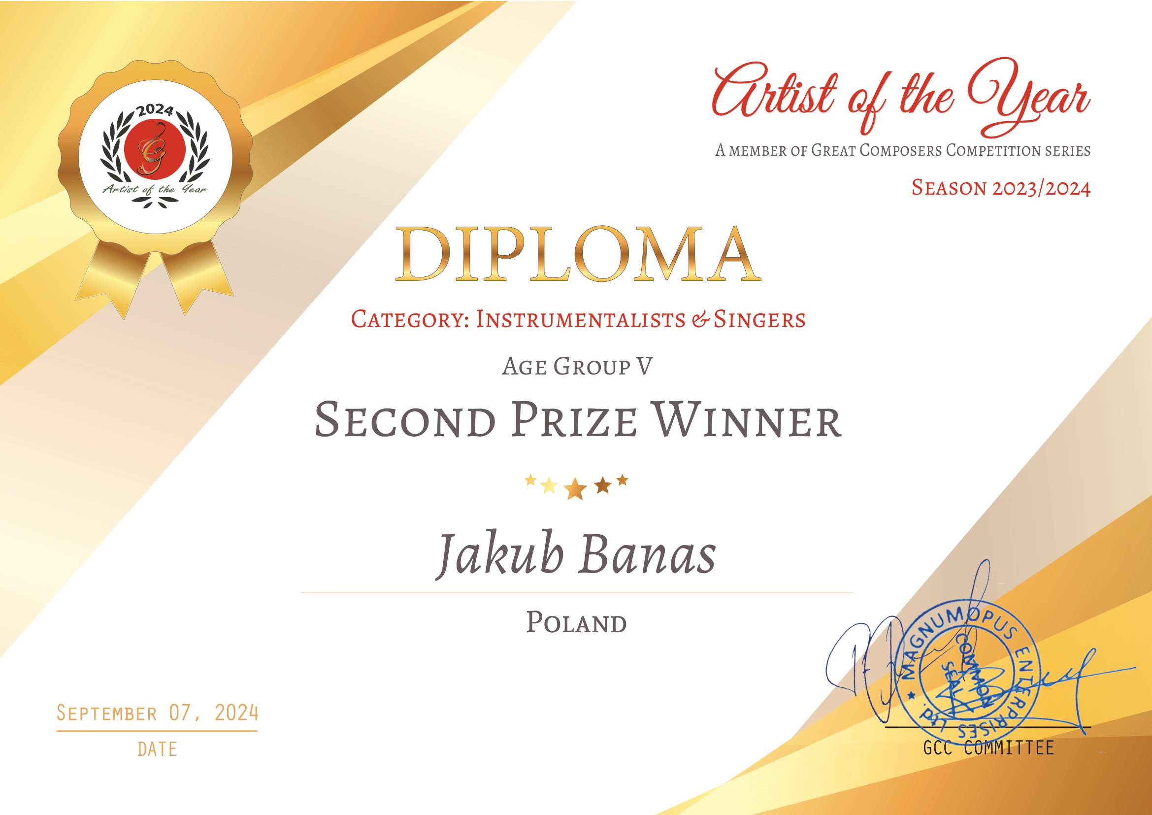 Jakub Banaś (I rok studiów I st.) z klasy fortepianu dra Michała Mossakowskiego zdobył II NAGRODĘ w kat. Instrumentalists & Singers w V grupie wiekowej podczas 8. edycji international competition for young performers „Artist of the Year” w Londynie/online (7.09.2024).