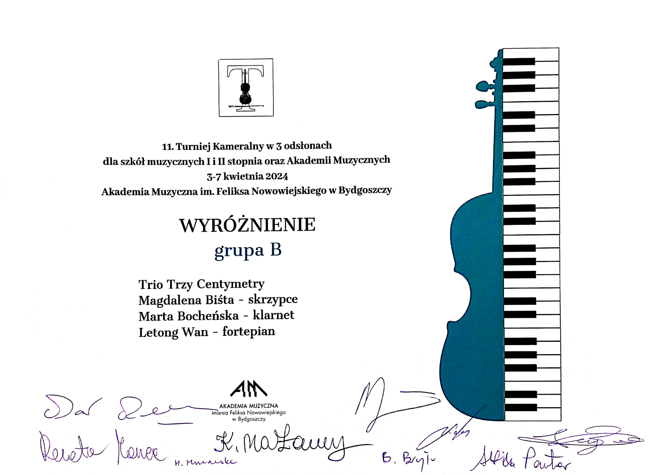 Trio Trzy Centymetry w składzie: Magdalena Biśta (III rok studiów I st.) – skrzypce, Marta Bocheńska (II rok studiów I st.) – klarnet, Letong Wan (II rok studiów II st.) – fortepian z klasy kameralistyki prof. dr hab. Karoliny Piątkowskiej-Nowickiej i dr Dominiki Glapiak-Piłasiewicz otrzymało WYRÓŻNIENIE w gr. B podczas XI Turnieju Kameralnego w Trzech Odsłonach dla szkół muzycznych I i II stopnia oraz Akademii Muzycznych, który odbył się w Akademii Muzycznej im. Feliksa Nowowiejskiego w Bydgoszczy (3-7.04.2024).
