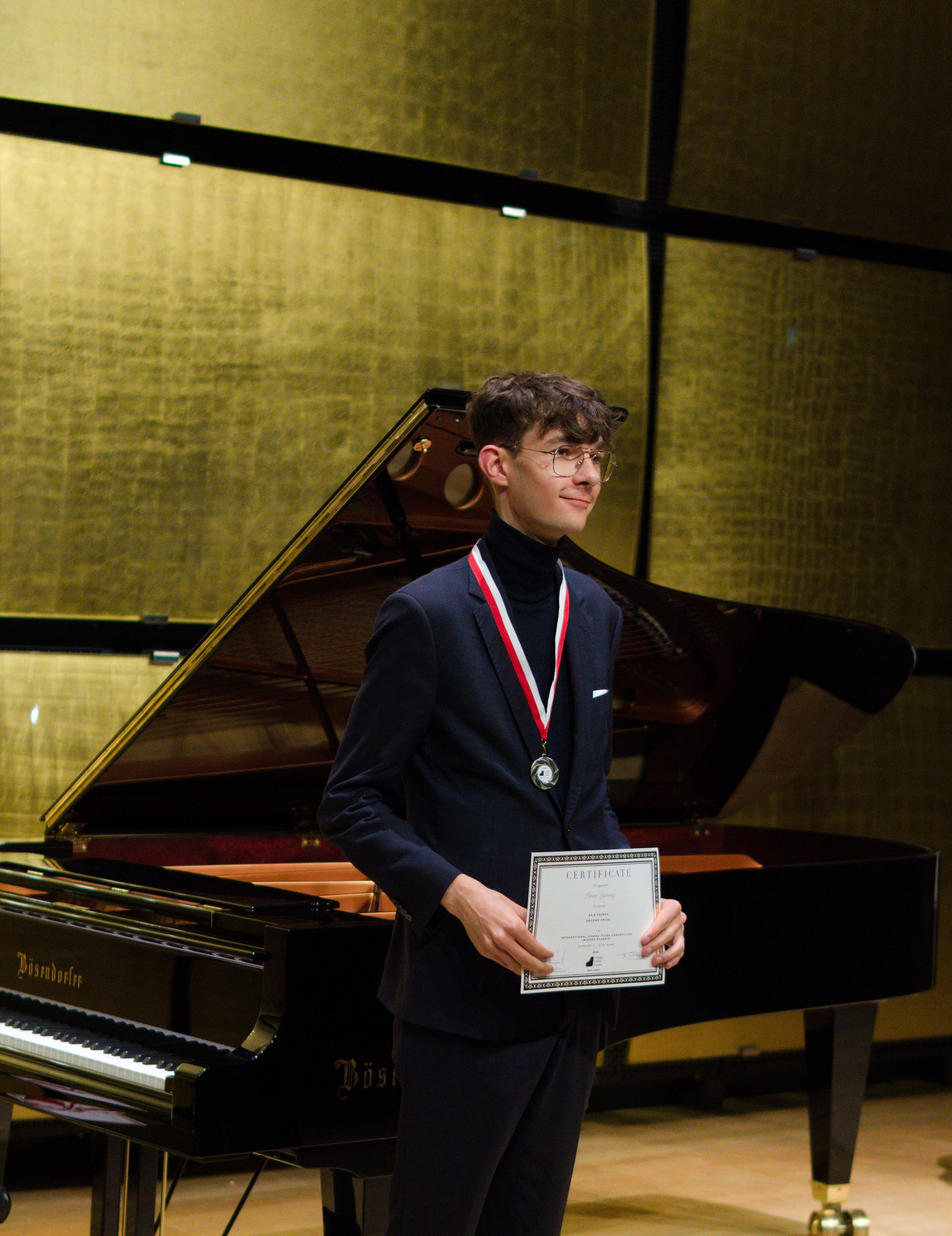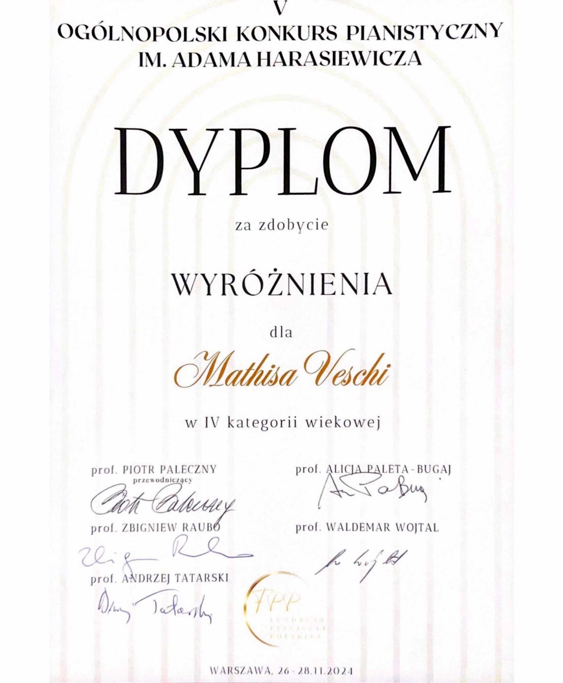 Mathis Veschi (III rok studiów I st.) z klasy fortepianu dra Macieja Gańskiego otrzymał WYRÓŻNIENIE w VI kategorii wiekowej w V Ogólnopolskim Konkursie Pianistycznym im. Adama Harasiewicza w Warszawie (26–28.11.2024).