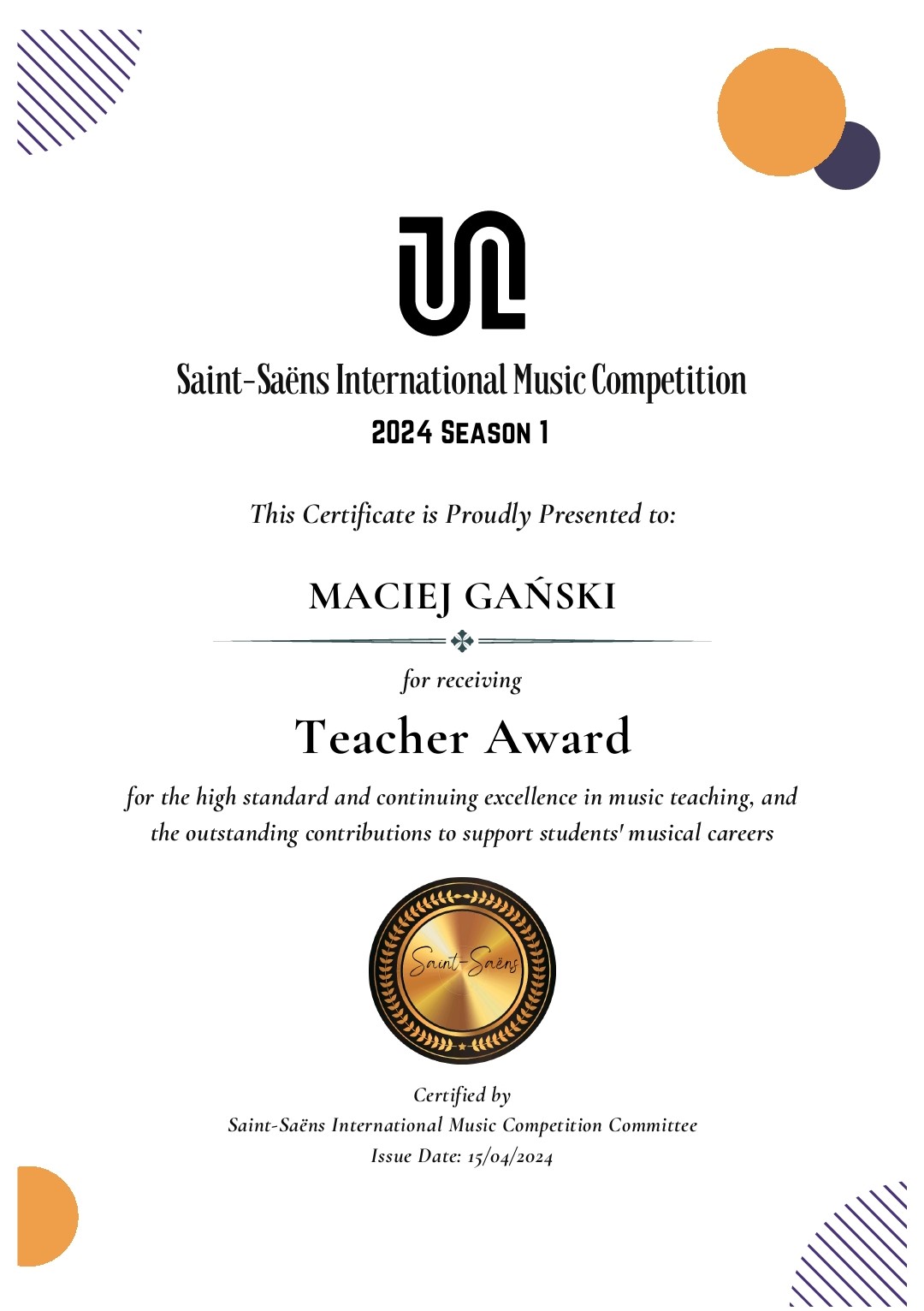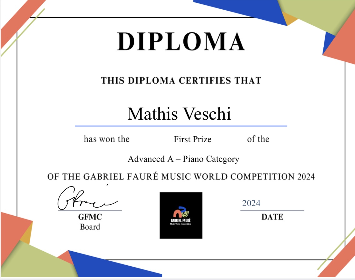 Mathis Veschi (III rok studiów I st.) z klasy fortepianu dra Macieja Gańskiego otrzymał I nagrodę w kategorii Advance A - Piano w The Gabriel Fauré Music World Competition 2024 (15.10-15.12.2024).