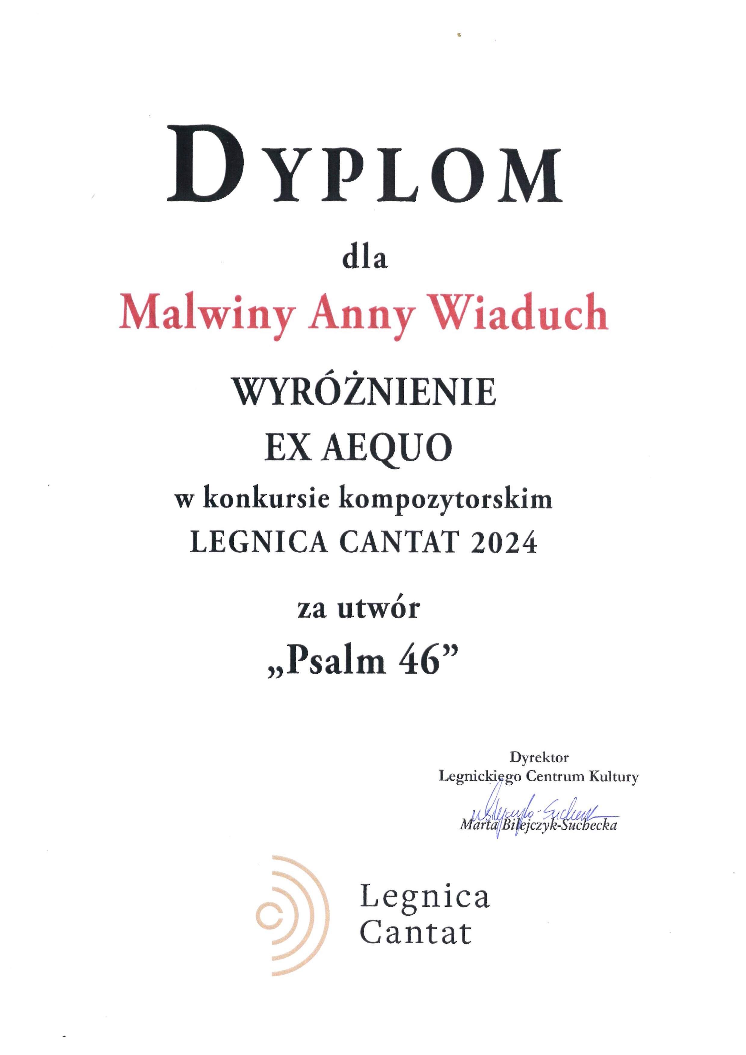 Malwina Wiaduch (I rok studiów I st.) z klasy kompozycji dra Marka Czerniewicza otrzymała WYRÓŻNIENIE ex aequo za utwór „Psalm 46” na chór mieszany w Konkursie Kompozytorskim w ramach 54. Festiwalu Legnica Cantat w Legnicy (24-26.05.2024).