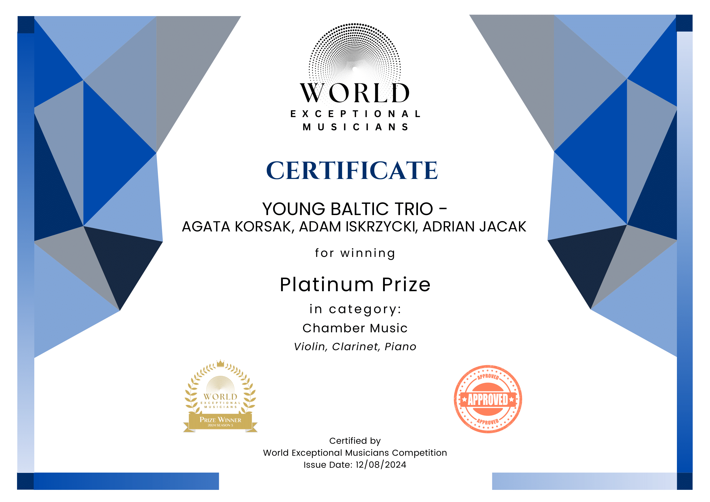 Young Baltic Trio w składzie: Agata Korsak (II rok studiów I st.) – skrzypce, Adam Iskrzycki (I rok studiów II st.) – klarnet, Adrian Jacak (I rok studiów I st.) – fortepian z klasy kameralistyki dr Mirosławy Sumlińskiej, dr Pauli Preuss oraz prof. Sebastiana Hamanna zdobyło PLATINUM PRIZE w kat. Chamber Music: Violin, Clarinet, Piano na World Exceptional Musicians Competition (12.08.2024).