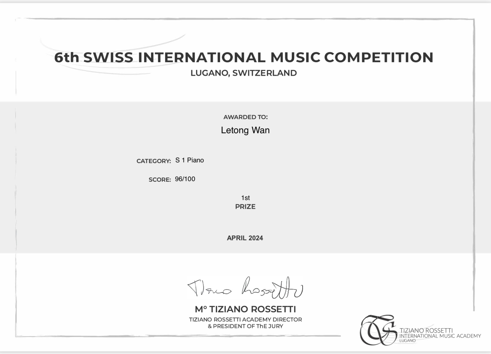 Letong Wan (II rok studiów II st.) z klasy fortepianu dra Macieja Gańskiego zdobyła I NAGRODĘ w 6th Swiss International Music Competition w Lugano/Szwajcaria (kwiecień 2024).