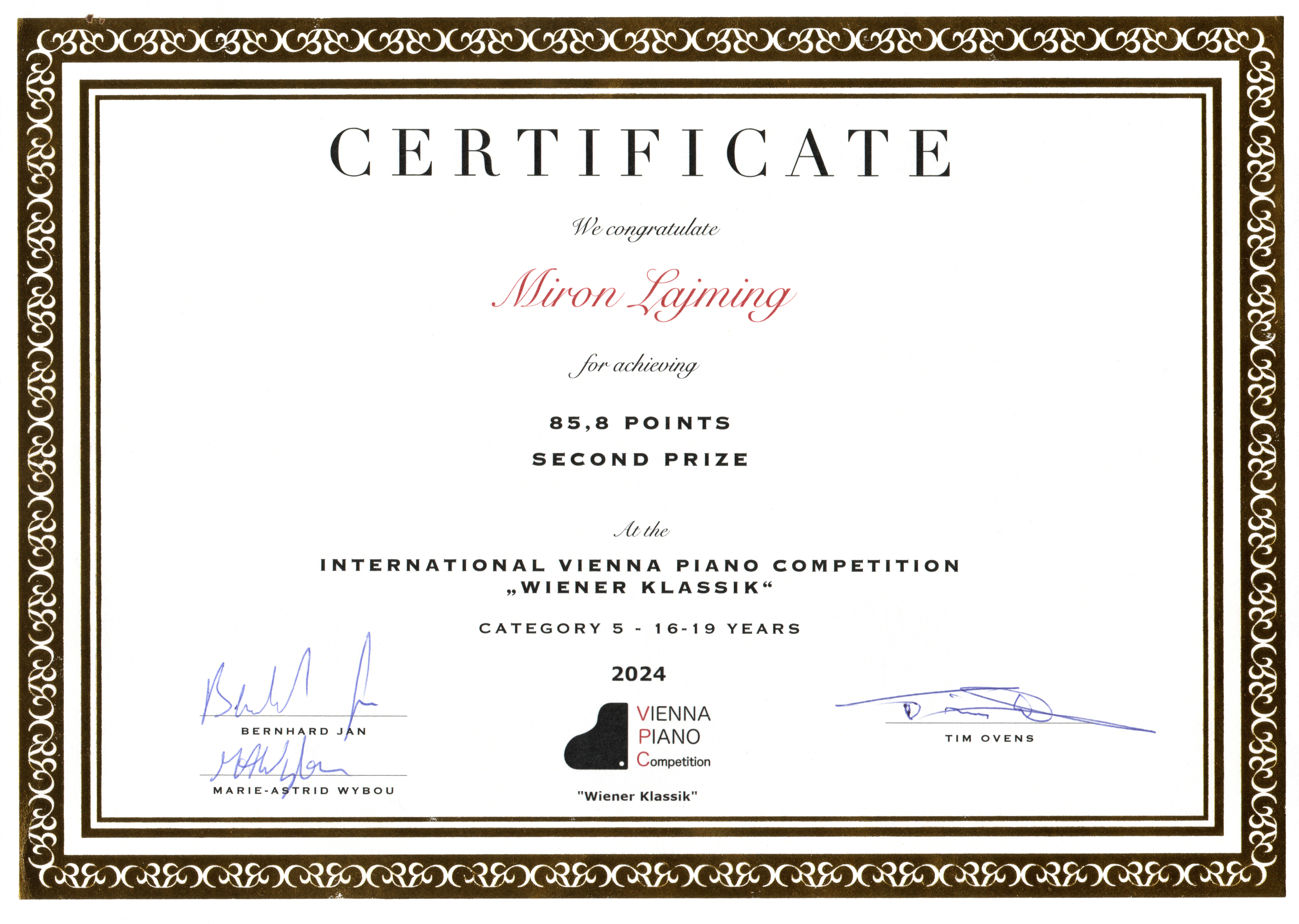 Miron Łajming (I rok studiów I st.) z klasy fortepianu dra Kordiana Góry i dra Mikołaja Sikały zdobył II NAGRODĘ w V kategorii wiekowej (16-19 lat) na International Vienna Piano Competition 2024 „Wiener Klassik”. W wyniku kwalifikacji, po I etapie online, II etap konkursu odbył się w Wiedniu, w dniach 20-22.07.2024 r. Konkurs odbywający się w ramach wydarzenia Vienna Piano Summer Festival został zorganizowany przez Vienna Piano School i miał miejsce w słynnym Palais Ehrbar. Udział Mirona był możliwy dzięki wsparciu ze środków Miasta Gdańska w ramach Gdańskiego Stypendium Kulturalnego Fundusz Mobilności.