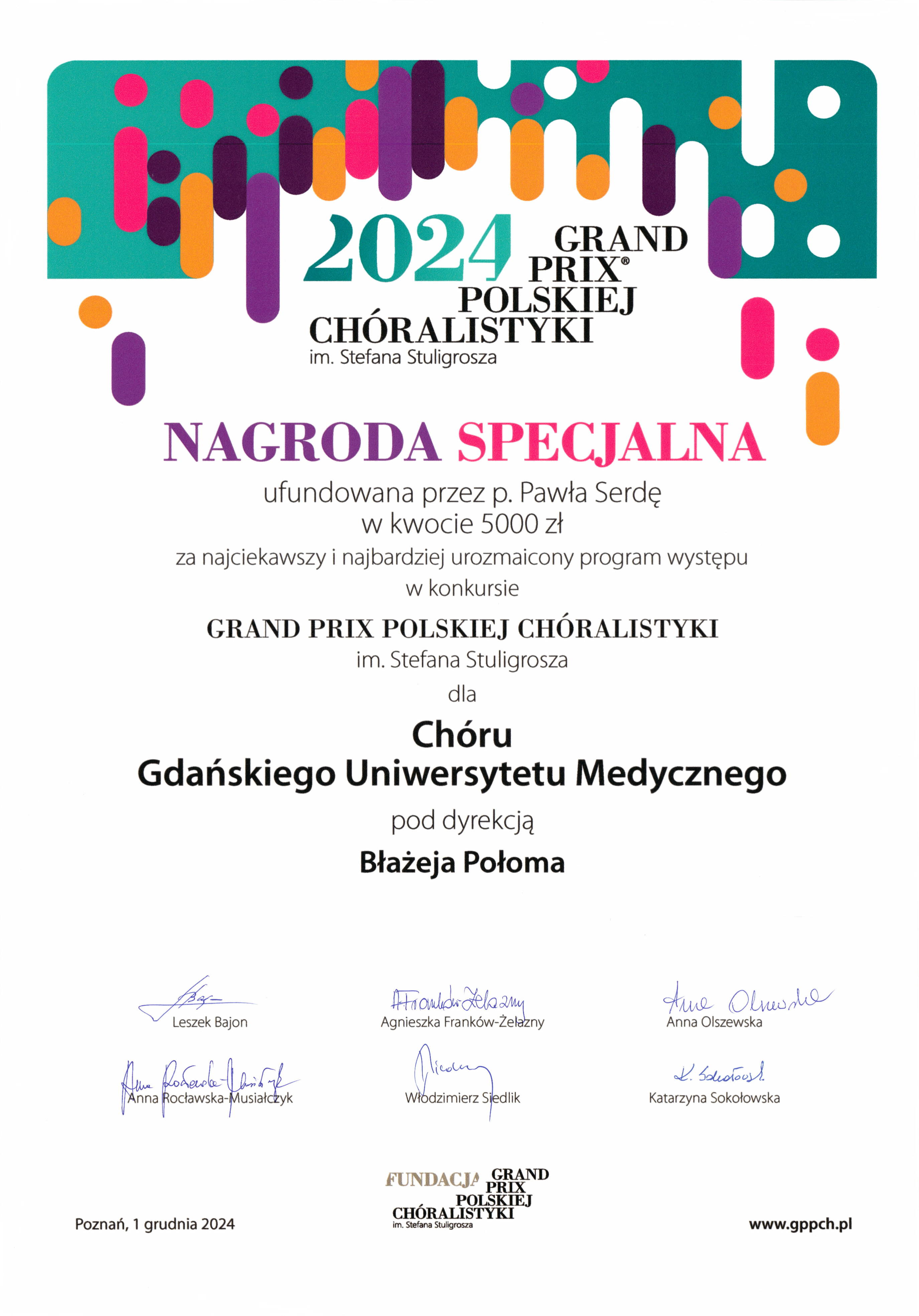 Chór Gdańskiego Uniwersytetu Medycznego im. Tadeusza Tylewskiego pod dyr. dra Błażeja Połoma, pedagoga aMuz, zdobył WYRÓŻNIENIE za najlepsze wykonanie utworu kompozytora polskiego urodzonego po 1950 roku oraz NAGRODĘ SPECJALNĄ ufundowaną przez p. Pawła Serdę w kwocie 5000 zł za najciekawszy i najbardziej urozmaicony program występu w konkursie Grand Prix Polskiej Chóralistyki im. Stefana Stuligrosza w Poznaniu (1.12.2024).