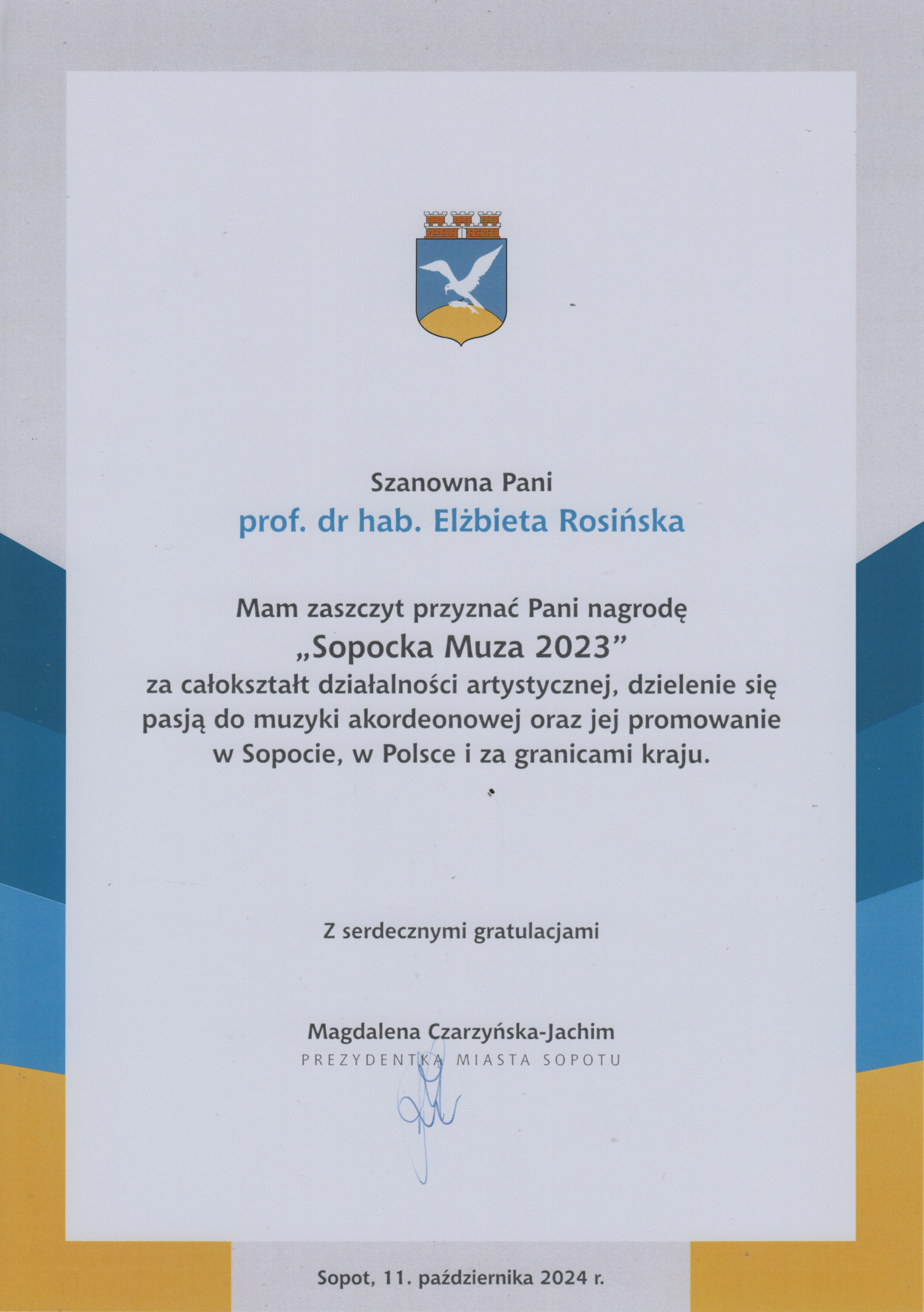 Prof. dr hab. Elżbieta Rosińska, pedagożka klasy akordeonu aMuz, została LAUREATKĄ Sopockiej Muzy – Nagrody Prezydenta Miasta Sopotu za osiągnięcia w dziedzinie kultury i sztuki w roku 2023. Uroczystość wręczenia nagrody odbyła się 11 października 2024 r. w Sali Słonecznej Polskiej Filharmonii Kameralnej w Sopocie. Nagrodę wręczyła Prezydent Sopotu – p. Magdalena Czarzyńska-Jachim. Wydarzenie uświetnił koncert „Belle Époque” w wykonaniu mezzosopranistki Karoliny Sikory oraz Polskiej Filharmonii Kameralnej Sopot pod dyr. Szymona Morusa.