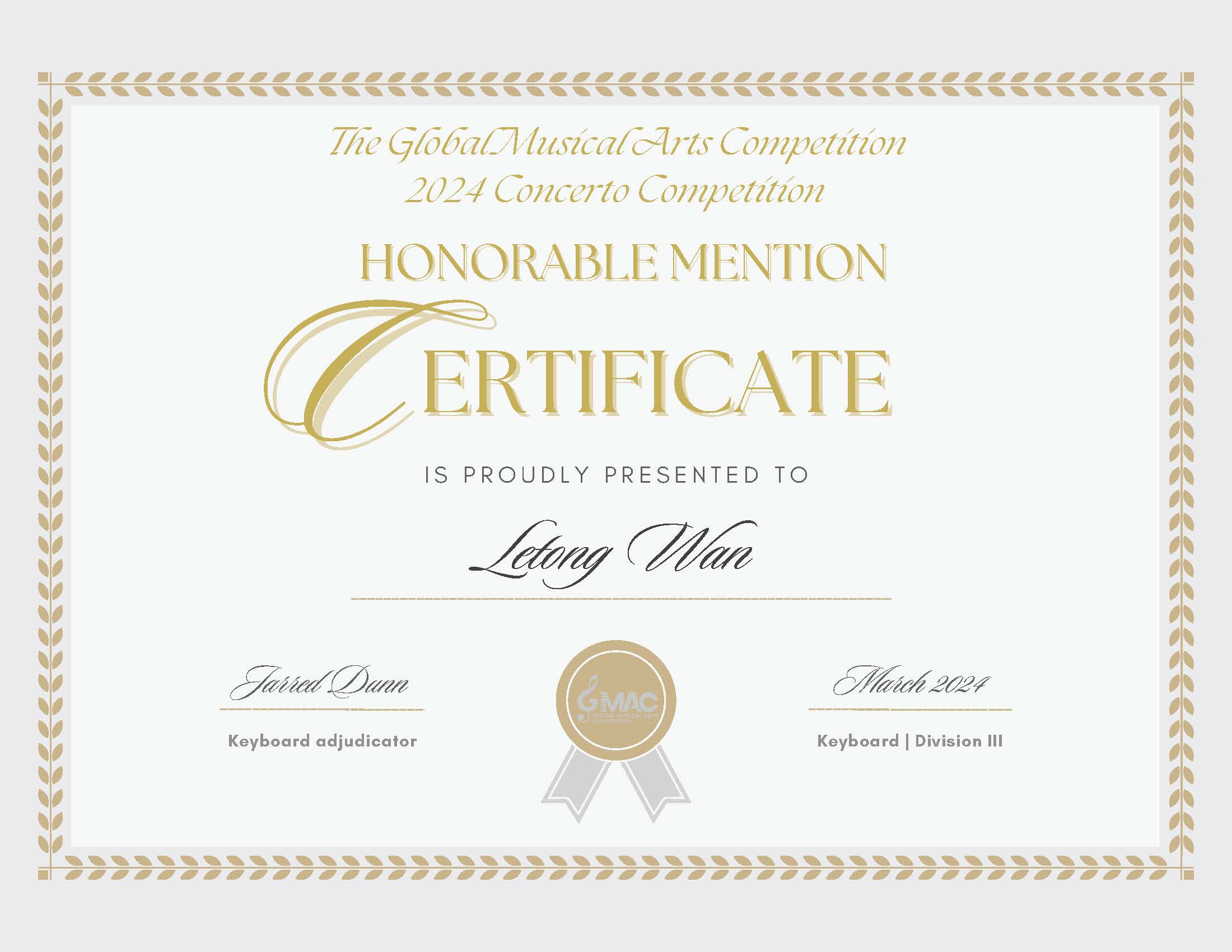 Letong Wan (II rok studiów II st.) z klasy fortepianu dra Macieja Gańskiego otrzymała WYRÓŻNIENIE na The Global Musical Arts Competition 2024 Concerto Competition (marzec 2024).