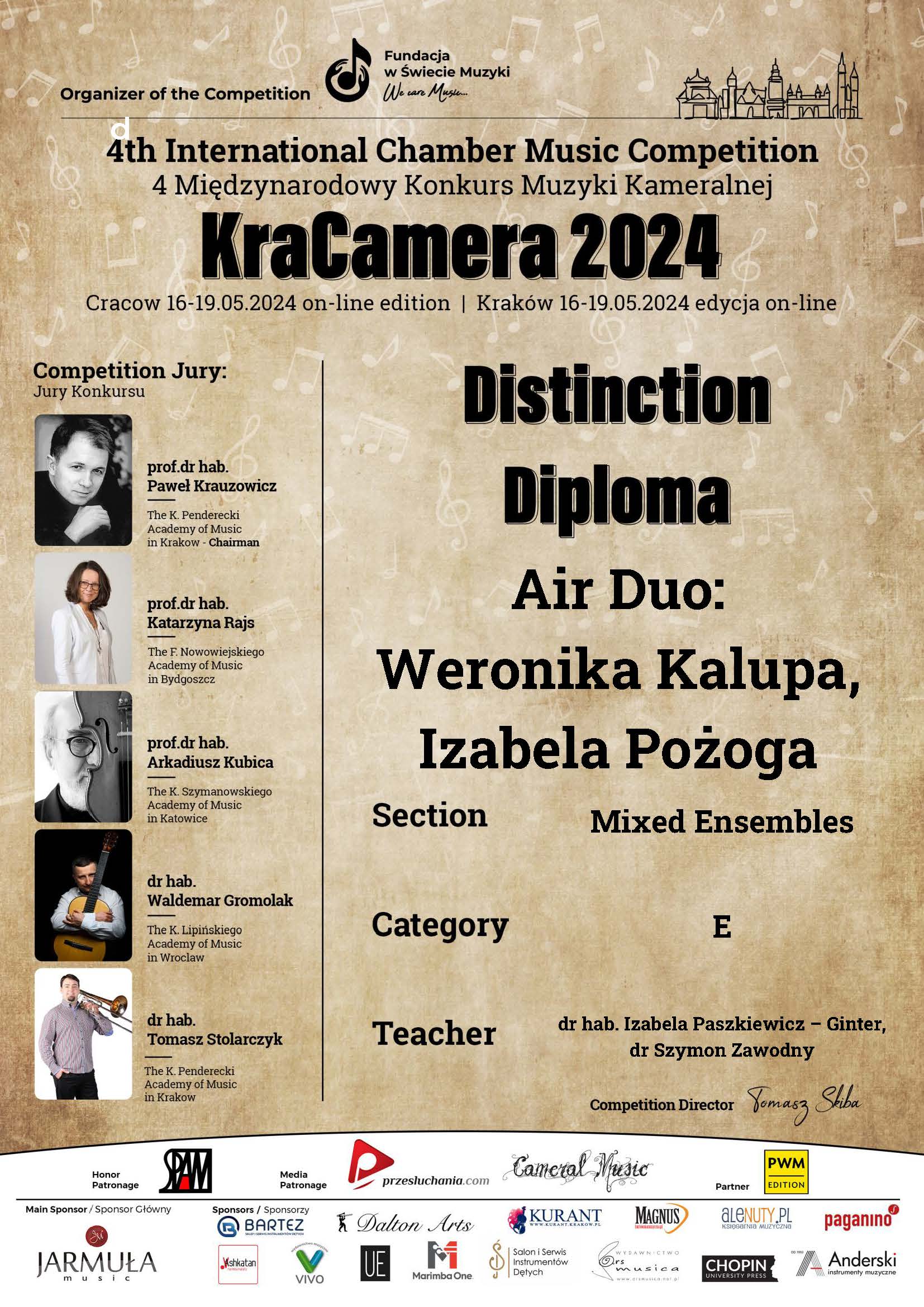 Air Duo w składzie: Weronika Kalupa (II rok studiów I st.) – saksofon i Izabela Pożoga (III rok studiów I st.) – fortepian z klasy nauki akompaniamentu dr hab. Izabeli Paszkiewicz-Ginter i dra Szymona Zawodnego zdobyło WYRÓŻNIENIE w sekcji Mixed Ensembles, kat. E na 4. Międzynarodowym Konkursie Muzyki Kameralnej KraCamera – edycja online (16-19.05.2024). Pedagodzy otrzymali DYPLOMY HONOROWE – BEST TEACHER za przygotowanie duetu do Konkursu.