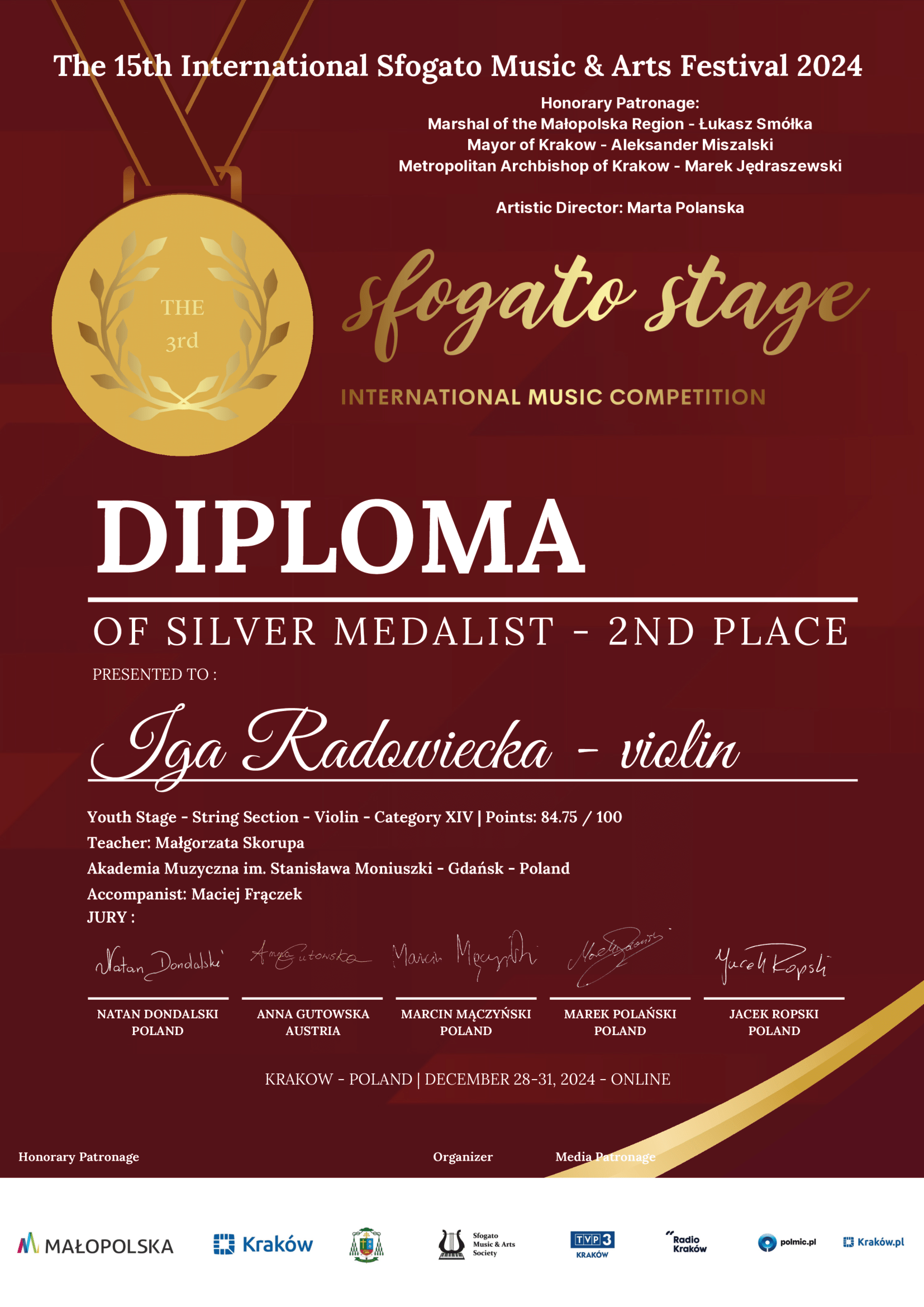 Iga Radowiecka (I rok studiów I st.) z klasy skrzypiec prof. dr hab. Małgorzaty Skorupy zdobyła II MIEJSCE / SREBRNY MEDAL w kat. XIV na III International Music Competition „Sfogato Stage” online w ramach 15th International Sfogato Music & Arts Festival 2024 w Krakowie (28.12-31.12.2024).