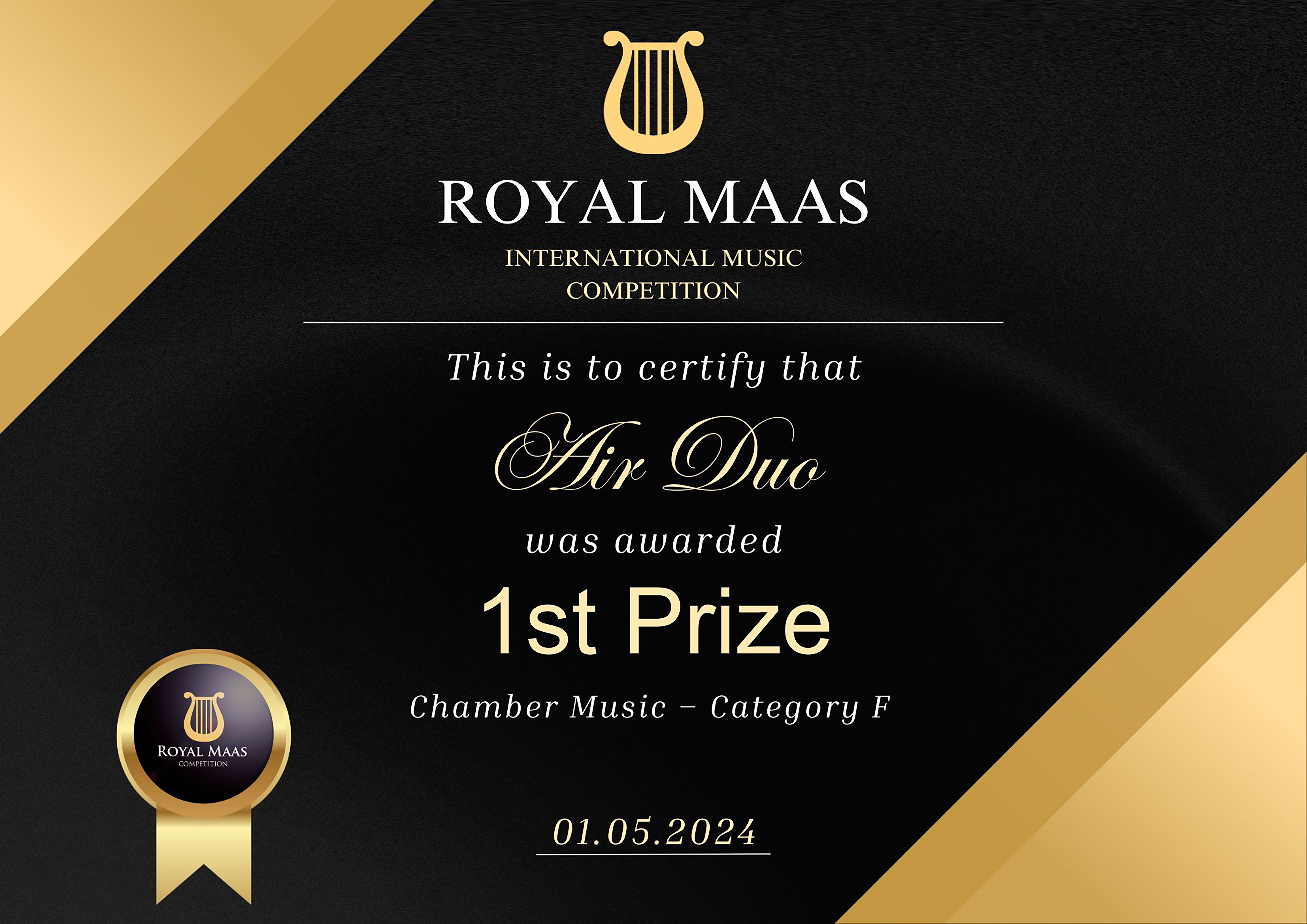 Air Duo w składzie: Weronika Kalupa (II rok studiów I st.) i Izabela Pożoga (III rok studiów I st.) z klasy nauki akompaniamentu dr Izabeli Paszkiewicz-Ginter i dra Szymona Zawodnego zdobyło I NAGRODĘ w kat. F – Chamber Music na Royal Maas International Music Competition (1.05.2024).