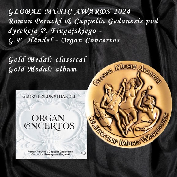 Prof. dr hab. Roman Perucki, pedagog klasy organów, wraz z zespołem Cappella Gedanensis (pod dyrekcją Przemysława Fugajskiego) otrzymali ZŁOTY MEDAL w plebiscycie Global Music Awards 2024 w kategoriach: Muzyka klasyczna oraz Najlepszy album za płytę „Organ Concertos” z muzyką Georga Friedricha Händla. Album jako jedyny uzyskał też status BEST OF SHOW (najlepszego wykonania spośród wszystkich zgłoszonych do konkursu).