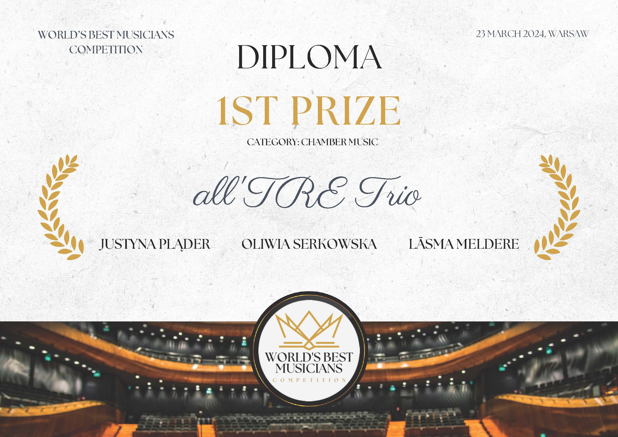 Zespół all'TRE Trio w składzie: Justyna Pląder (III rok studiów I st.) – skrzypce, Oliwia Serkowska (I rok studiów II st.) – wiolonczela, Lāsma Monika Meldere (I rok studiów II st.) – fortepian, z klasy kameralistyki dr Ewy Sarwińskiej-Kowalczyk, dr Pauli Preuss i prof. Sebastiana Hamanna otrzymał I NAGRODĘ w kat. Chamber Music na 3rd World's Best Musicians Competiton w formule online (23.03.2024).