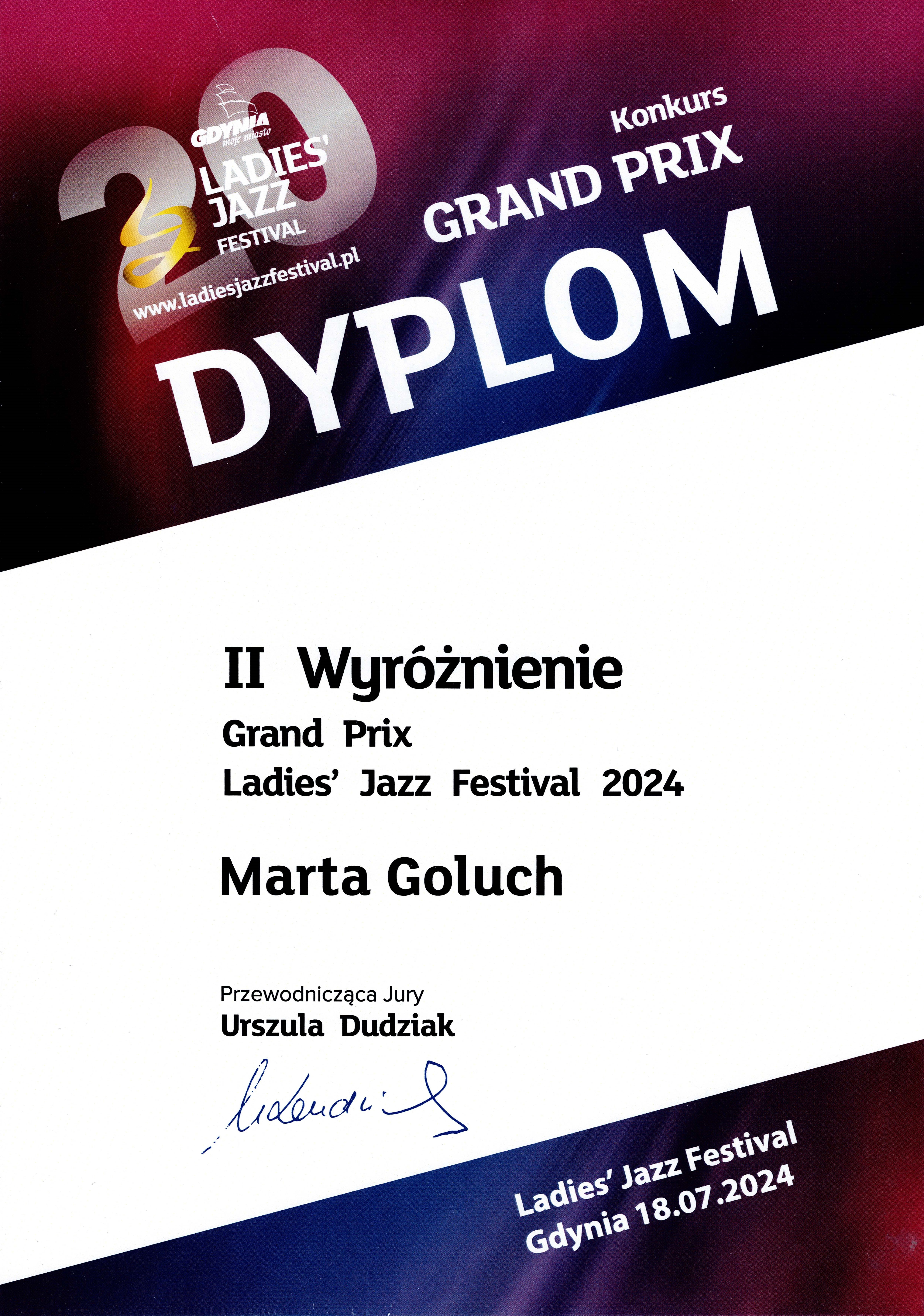 Marta Goluch (absolwentka studiów I st., 2024) z klasy śpiewu jazzowego dr Krystyny Stańko zdobyła DRUGIE WYRÓŻNIENIE w Konkursie o Grand Prix XX Ladies’ Jazz Festival 2024 w Gdyni (17.07.2024). W trakcie występu finałowego Marta Goluch wraz z zespołem w składzie: Dawid Kamiński – fortepian, Bartłomiej Brózda – kontrabas, oraz Kacper Skolik – perkusja, zaprezentowała autorski spektakl muzyczny „Apetyt na Szczerość”.