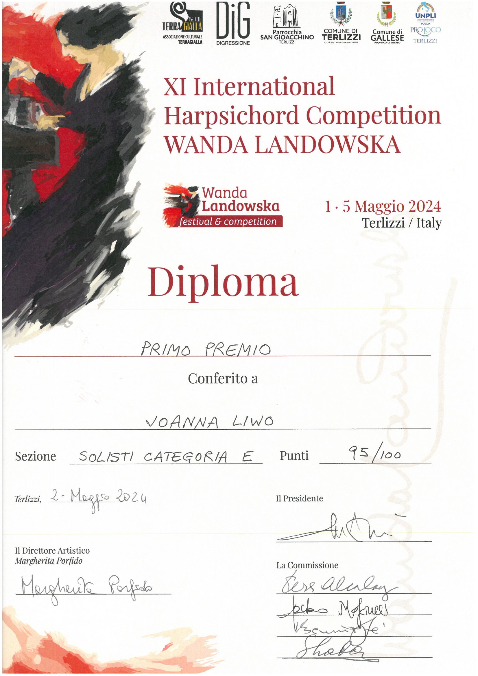 Joanna Liwo (II rok studiów I st.) z klasy klawesynu prof. dr hab. Małgorzaty Skotnickiej zdobyła I MIEJSCE w kat. E na XI International Harpsichord Competition WANDA LANDOWSKA w Terlizzi/Włochy (1-5.05.2024).