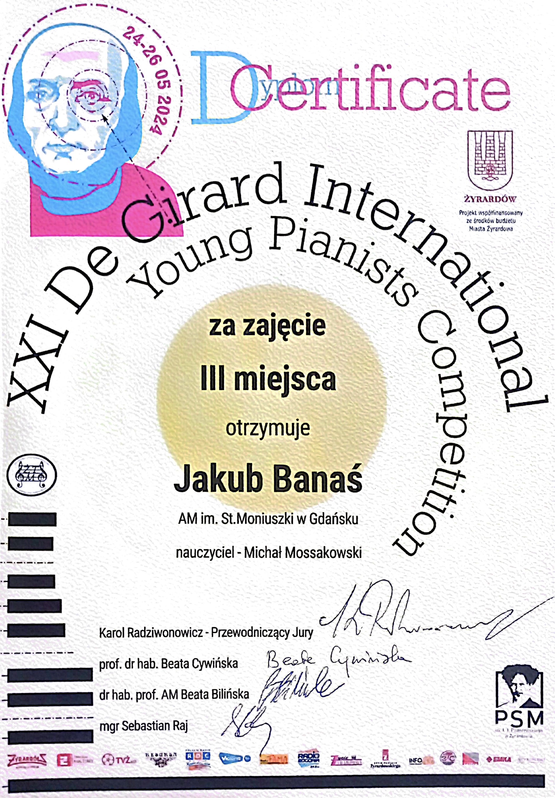 Jakub Banaś (I rok studiów I st.) z klasy fortepianu dra Michała Mossakowskiego zdobył III MIEJSCE na XXI De Girard International Young Pianists Competition w Żyrardowie (24-26.05.2024).