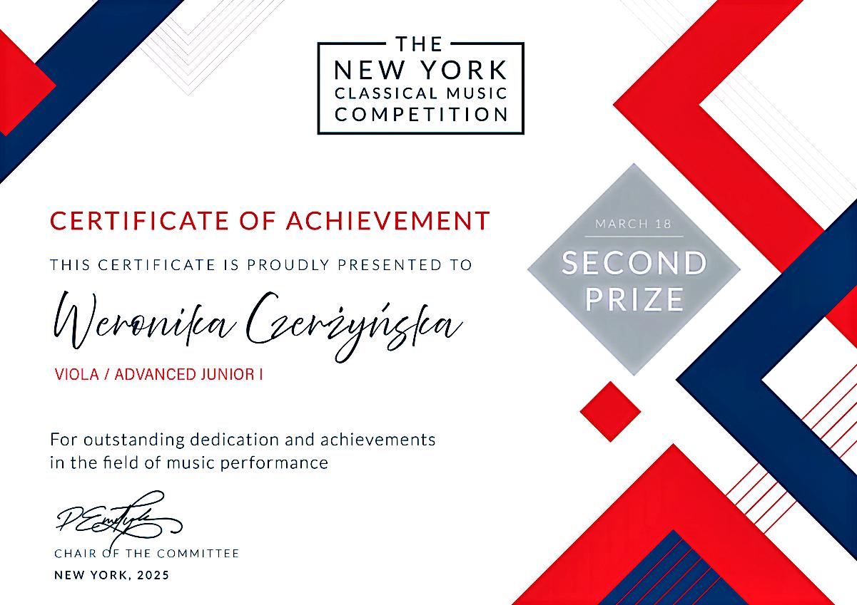 Weronika Czerżyńska (I rok studiów I st.) z klasy altówki prof. dra hab. Krzysztofa Komendarka-Tymendorfa i mgr Marii Wiczyńskiej zdobyła II NAGRODĘ w kat. Advanced Junior I – Viola na New York Classical Music Competition 2024 (20.06.2024).
