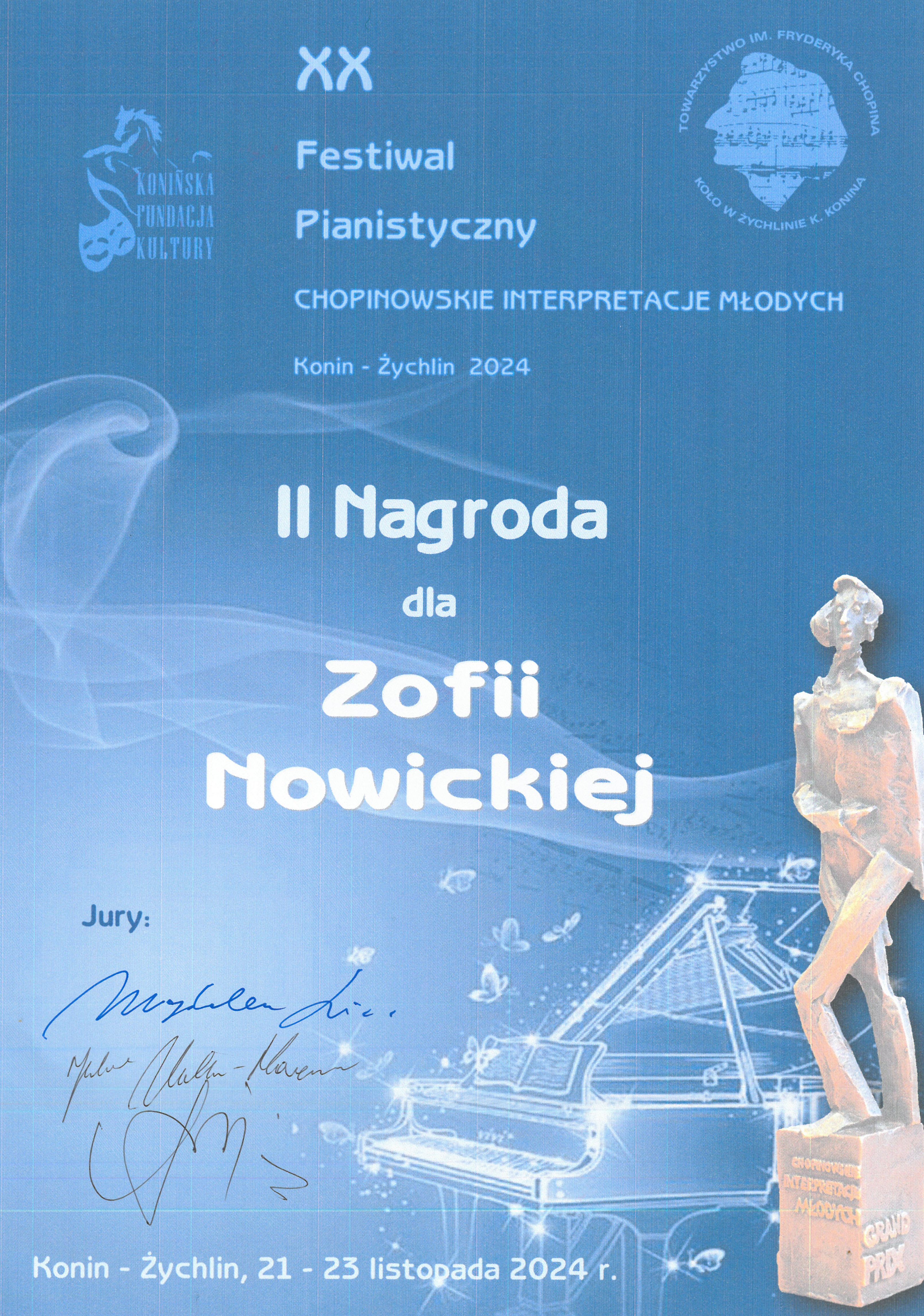 Zofia Nowicka (I rok studiów I st.) z klasy fortepianu dra Kordiana Góry zajęła II MIEJSCE na XX Festiwalu Pianistycznym „Chopinowskie Interpretacje Młodych” w Koninie-Żychlinie (21–23.11.2024).
