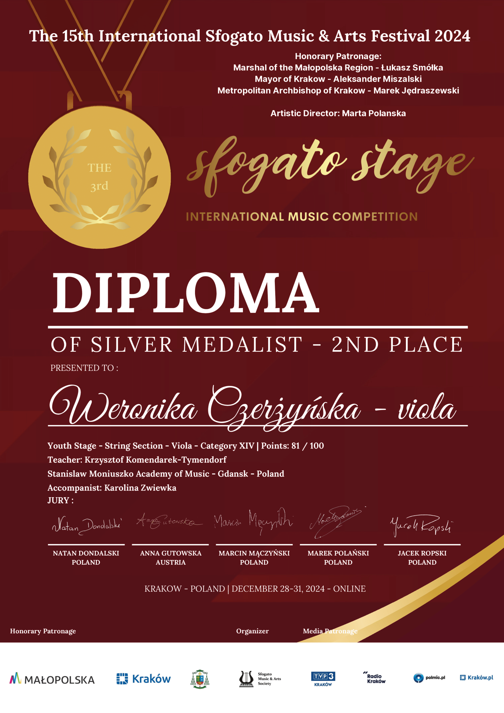Weronika Czerżyńska (I rok studiów I st.) z klasy altówki prof. dra hab. Krzysztofa Komendarka-Tymendorfa zdobyła II MIEJSCE / SREBRNY MEDAL w kat. XIV na III International Music Competition „Sfogato Stage” online w ramach 15th International Sfogato Music & Arts Festival 2024 w Krakowie (28.12-31.12.2024).