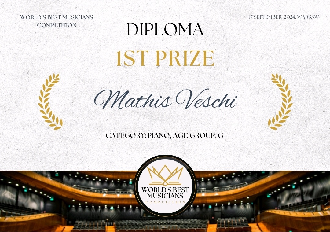 Mathis Veschi (III rok studiów I st.) z klasy fortepianu dra Macieja Gańskiego zdobył I MIEJSCE w kat. fortepian, grupie wiekowej G, na World's Best Musicians Competition (Warszawa, 17.09.2024).