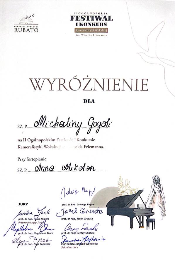 Michalina Gogola (III rok studiów I st.) z klasy śpiewu solowego dra hab. Krzysztofa Bobrzeckiego zdobyła WYRÓŻNIENIE na II Ogólnopolskim Konkursie Kameralistyki Wokalnej im. Witolda Friemanna w Jarosławiu (17-21.11.2024). Do drugiego etapu tego konkursu zakwalifikowały się również Anna Mosakowska (II rok studiów I st.) z klasy śpiewu solowego prof. dr hab. Anny Fabrello i Wiktoria Rudnicka (I rok studiów II st.) z klasy śpiewu solowego prof. dr hab. Ewy Marciniec i mgra Tomasza Raffa. Wszystkim studentom aMuz na konkursie towarzyszyła pianistka prof. dr hab. Anna Mikolon.