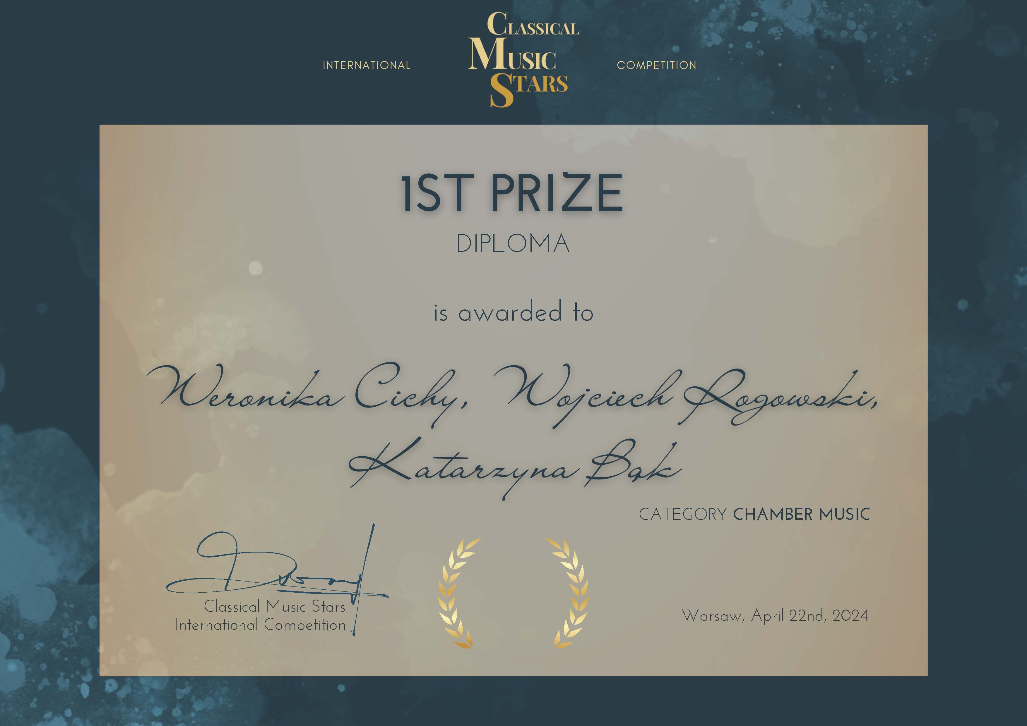 Trio w składzie: Weronika Cichy (I rok studiów II st.) – klarnet, Wojciech Rogowski (I rok studiów II st.) – skrzypce, Katarzyna Bąk (I rok studiów II st.) – fortepian z klasy kameralistyki prof. dr hab. Anny Prabuckiej-Firlej i dra Adama Bruderka zdobyło I MIEJSCE w kat. zespołów kameralnych na Międzynarodowym Konkursie online „Classical Music Stars” w Warszawie (22.04.2024).