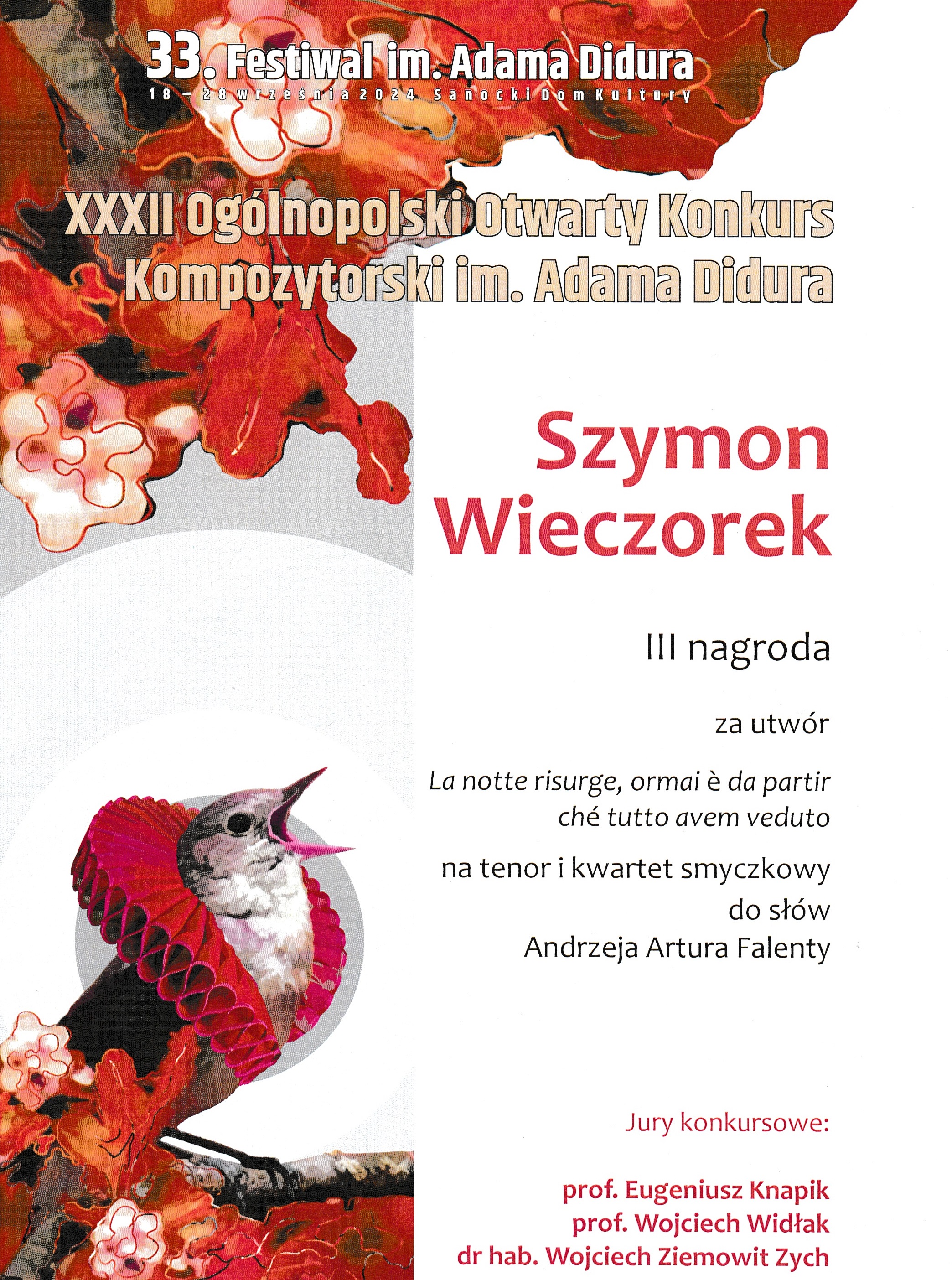 Szymon Wieczorek (I rok studiów II st.) z klasy mgra Pawła Mykietyna zdobył III NAGRODĘ na XXXII Ogólnopolskim Otwartym Konkursie Kompozytorskim im. Adama Didura w ramach 33. Festiwalu im. Adama Didura w Sanoku (30.09.2024).