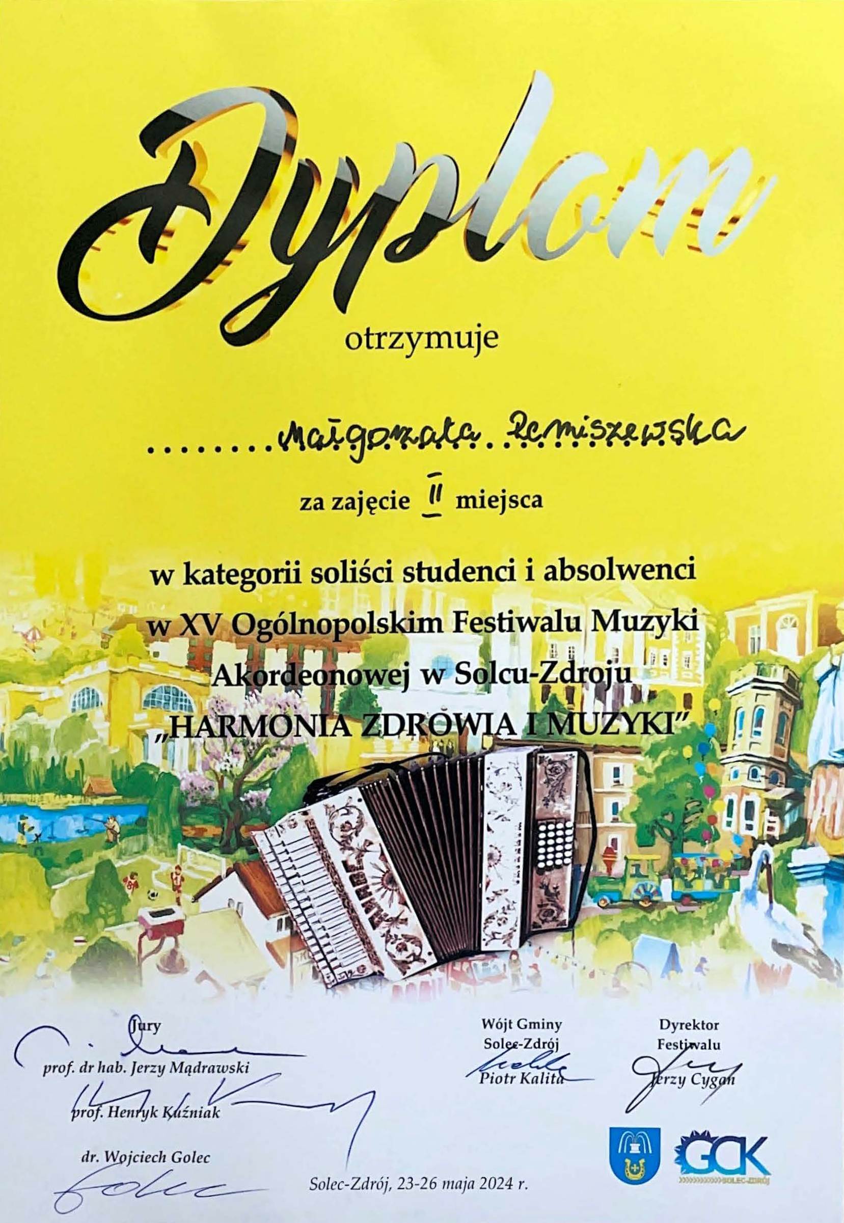 Małgorzata Remiszewska (I rok studiów II st.) z klasy prof. dr hab. Elżbiety Rosińskiej oraz dra hab. Pawła Zagańczyka zdobyła II MIEJSCE w kat. soliści studenci i absolwenci oraz NAGRODĘ SPECJALNĄ na XV Ogólnopolskim Festiwalu Muzyki Akordeonowej w Solcu-Zdroju „Harmonia Zdrowia i Muzyki” (23-26.05.2024).