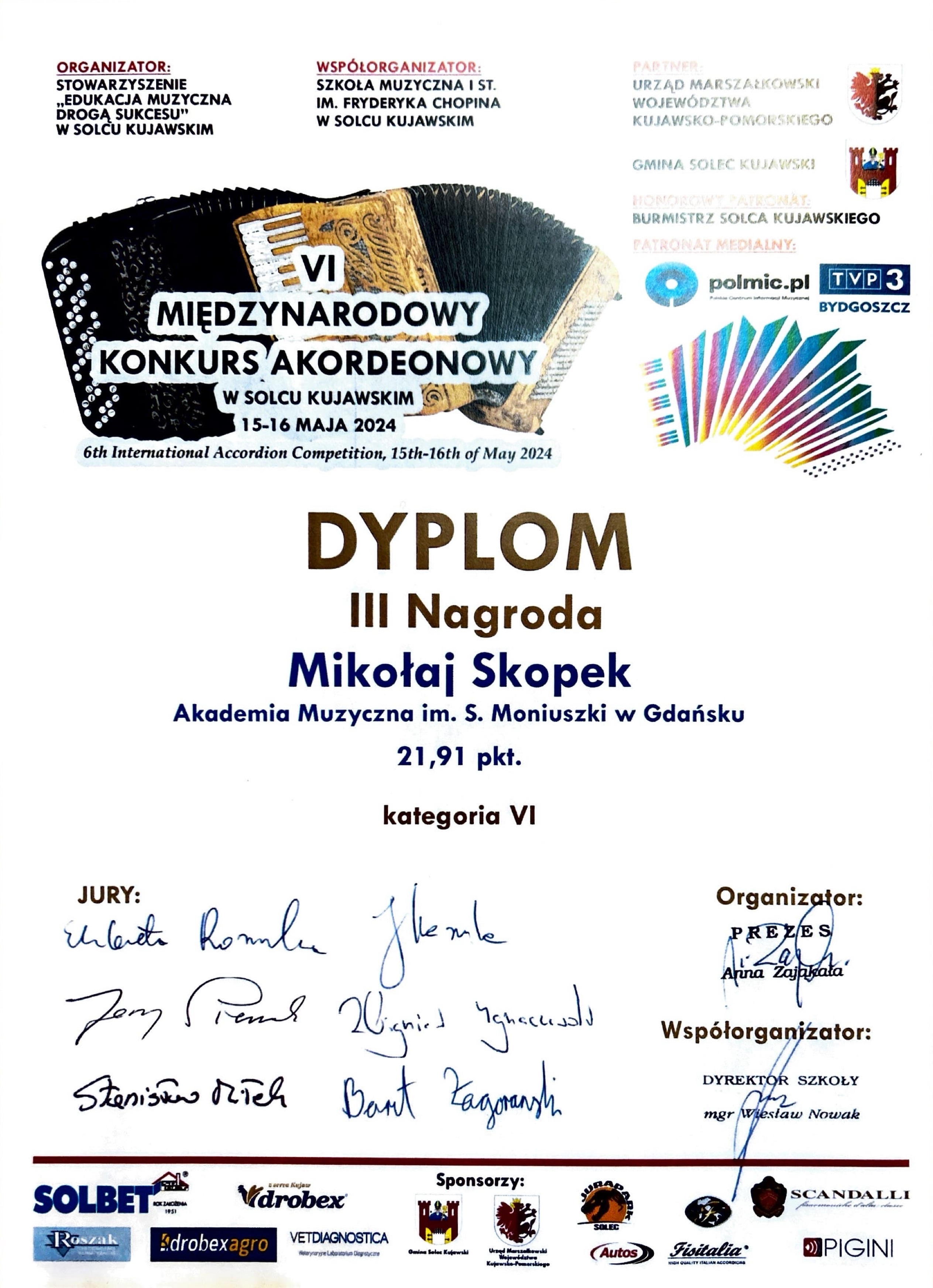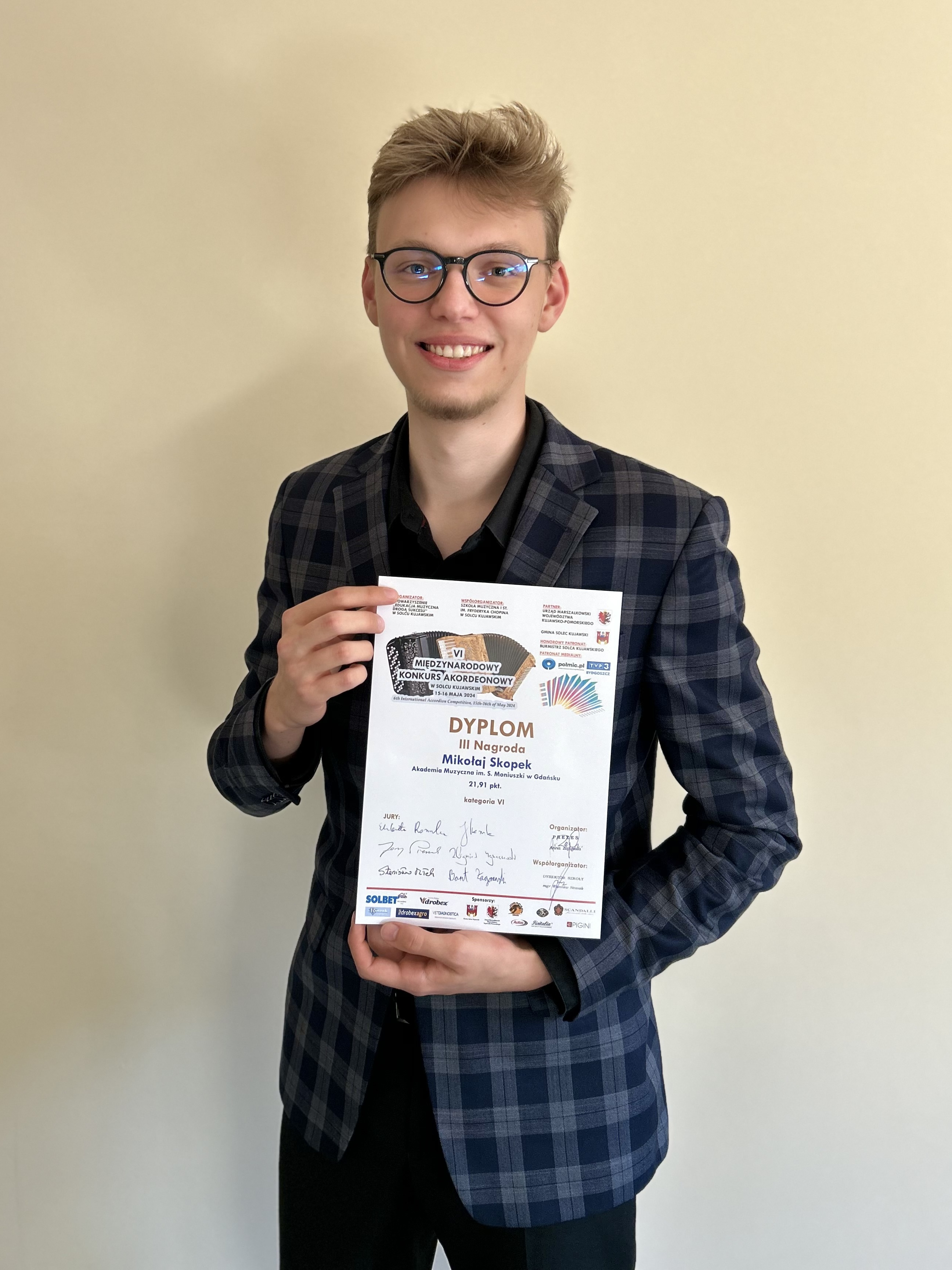 Mikołaj Skopek (II rok studiów I st.) z klasy akordeonu prof. dr hab. Elżbiety Rosińskiej i dra hab. Pawła Zagańczyka zdobył III NAGRODĘ podczas VI Międzynarodowego Konkursu Akordeonowego w Solcu Kujawskim (15-16.05.2024).