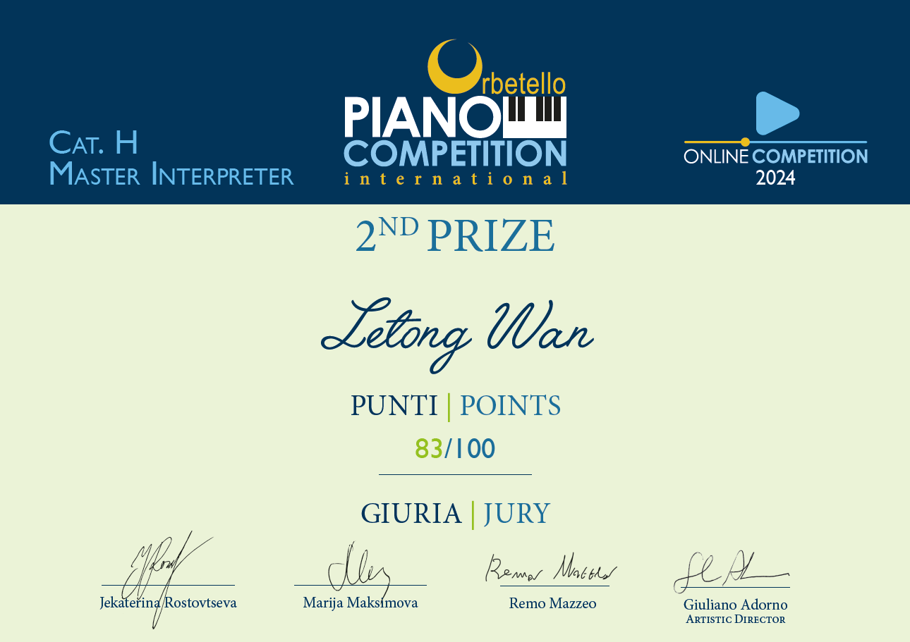 Letong Wan (II rok studiów II st.) z klasy fortepianu dra Macieja Gańskiego otrzymała II NAGRODĘ w kat. H – Master Interpreter na International Orbetello Piano Competition 2024 (7.05.2024).