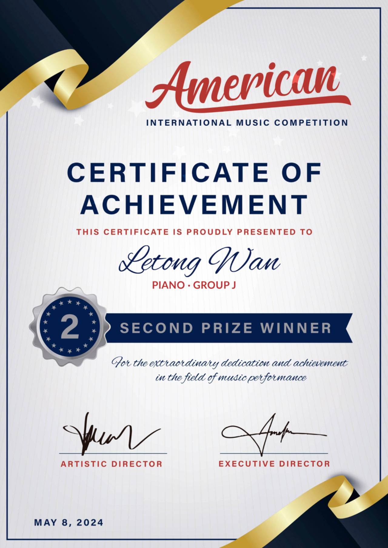 Letong Wan (II rok studiów II st.) z klasy fortepianu dra Macieja Gańskiego zdobyła II NAGRODĘ w American International Music Competition (8.05.2024).