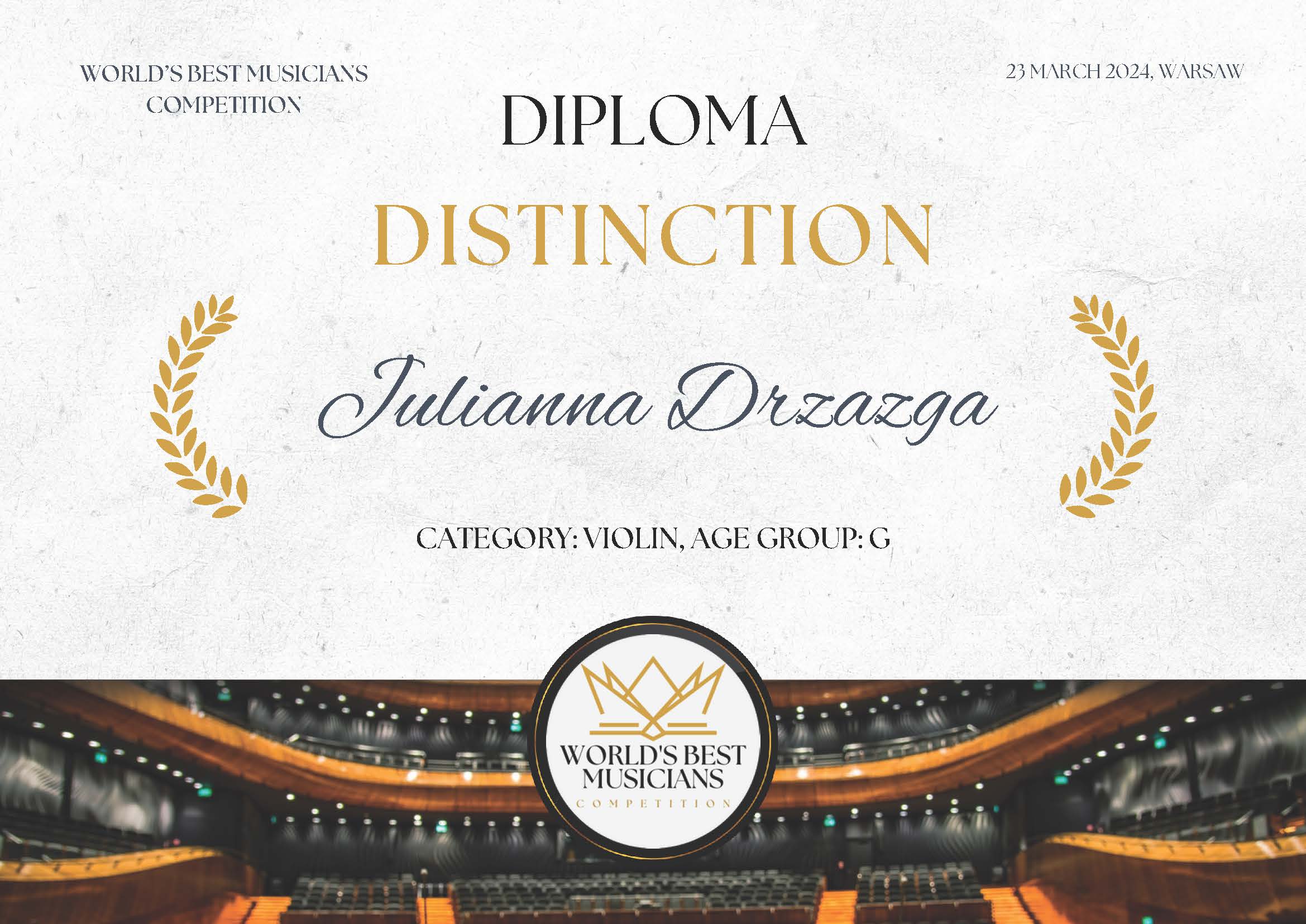 Julianna Drzazga (III rok studiów I st.) z klasy skrzypiec prof. dra hab. Macieja Sobczaka otrzymała WYRÓŻNIENIE w kat. skrzypce, w grupie wiekowej G, na 3rd World's Best Musicians Competition w formule online (23.03.2024).