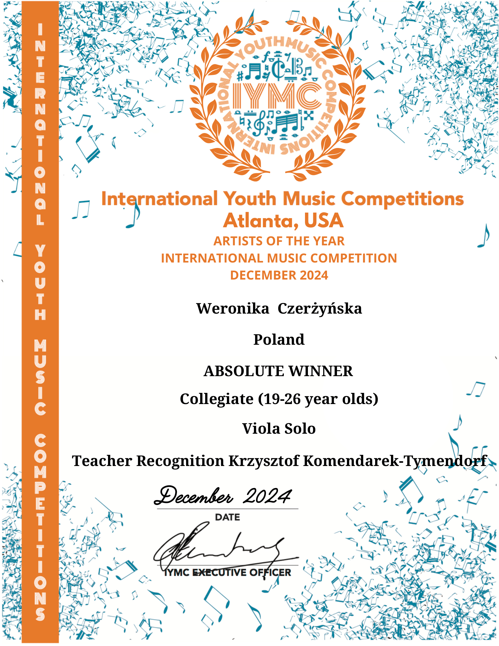 Weronika Czerżyńska (I rok studiów I st.) z klasy altówki prof. dra hab. Krzysztofa Komendarka-Tymendorfa zdobyła tytuł „ABSOLUTE WINNER” w kategorii Viola Solo na International Youth Music Competitions Atlanta, USA (grudzień 2024).