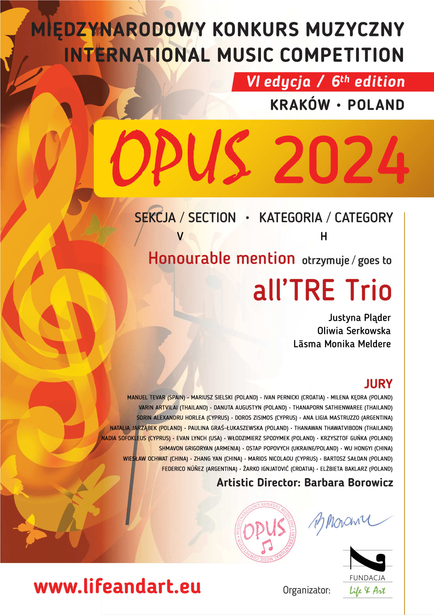 Zespół all'TRE Trio w składzie: Justyna Pląder (III rok studiów I st.) – skrzypce, Oliwia Serkowska (I rok studiów II st.) – wiolonczela, Lāsma Monika Meldere (I rok studiów II st.) – fortepian, z klasy kameralistyki dr Ewy Sarwińskiej-Kowalczyk, dr Pauli Preuss i prof. Sebastiana Hamanna zdobył WYRÓŻNIENIE w sekcji V, kat. H podczas VI edycji Międzynarodowego Konkursu Muzycznego „OPUS 2024” w Krakowie (20.05.2024).