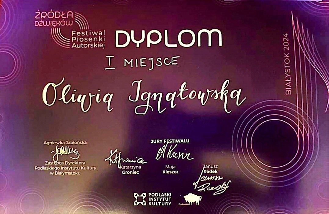 Oliwia Ignatowska (II rok studiów II st.) z klasy dra hab. Mariusza Klimka zdobyła I MIEJSCE ex aequo za utwory „gfty” (sł. Oliwia Ignatowska, muz. Oliwia Ignatowska, Bartłomiej Leśniewski, Bartłomiej Ostrowski) oraz „paco rabanne” (sł. Oliwia Ignatowska, muz. Oliwia Ignatowska, Bartłomiej Leśniewski, Bartłomiej Ostrowski) na pierwszej edycji Festiwalu Piosenki Autorskiej „Źródła Dźwięków” w Białymstoku (22.09.2024).
