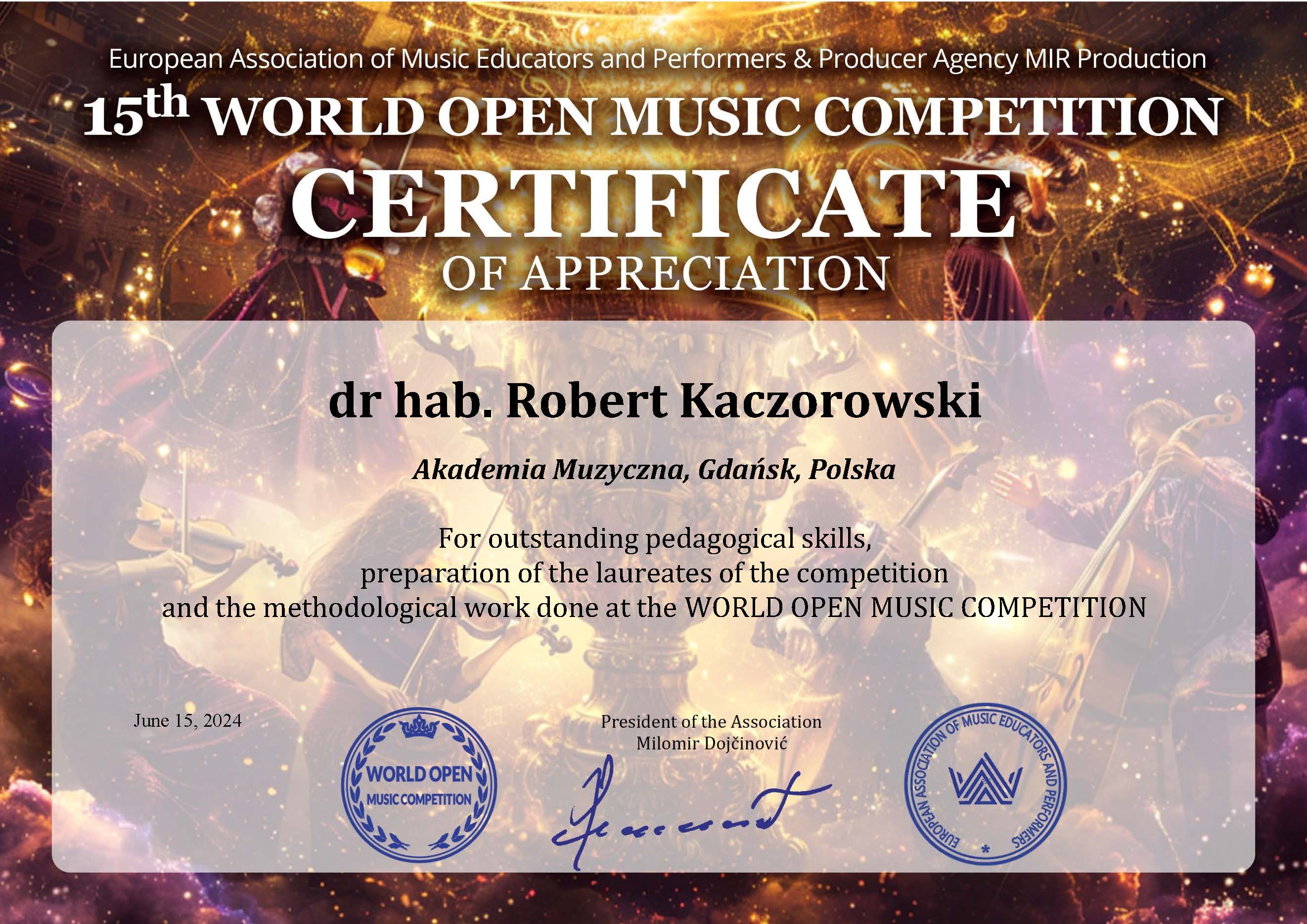 Qinyuan Wang (rok „0”, przygotowawczy do studiów magisterskich) z klasy śpiewu solowego dra hab. Roberta Kaczorowskiego zdobył II NAGRODĘ w sekcji CLASSICAL SINGING, kat. SENIOR ARTIST i tytuł „PROMISING PERFORMER” podczas 15th World Open Music Competition w Belgradzie/Serbia (15.06.2024). Przy fortepianie studentowi towarzyszyła prof. dr hab. Anna Mikolon. Organizatorem konkursu w formule online jest European Association of Music Educators and Performers & Producer Agency MIR Production.