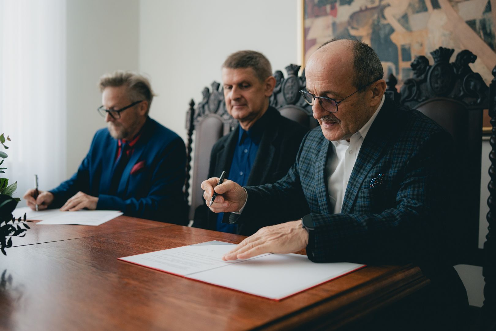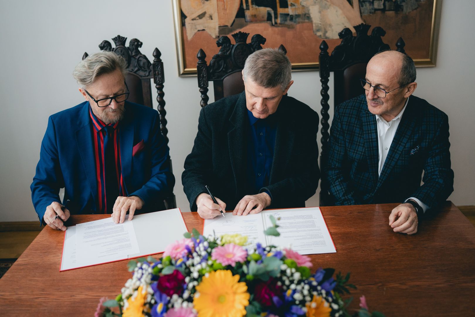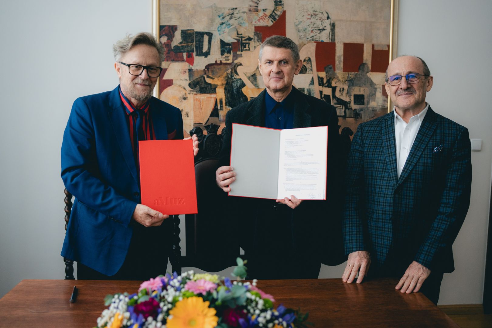 Uroczyste podpisanie porozumienia miało miejsce w poniedziałek 14 kwietnia 2025 r. w Gabinecie Rektora aMuz. Ze strony naszej uczelni podpis złożył Rektor aMuz prof. dr hab. Ryszard Minkiewicz, zaś ze strony Stowarzyszenia – Georgis Bogdanis – Wiceprzewodniczący – Członek Prezydium, oraz prof. Marek Skowronek – Członek Zarządu, redaktor Radia Danielka.