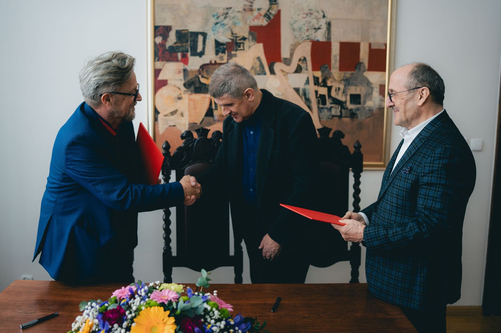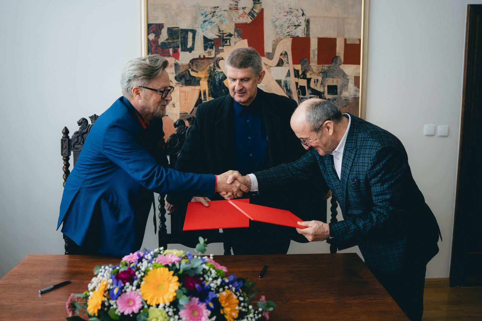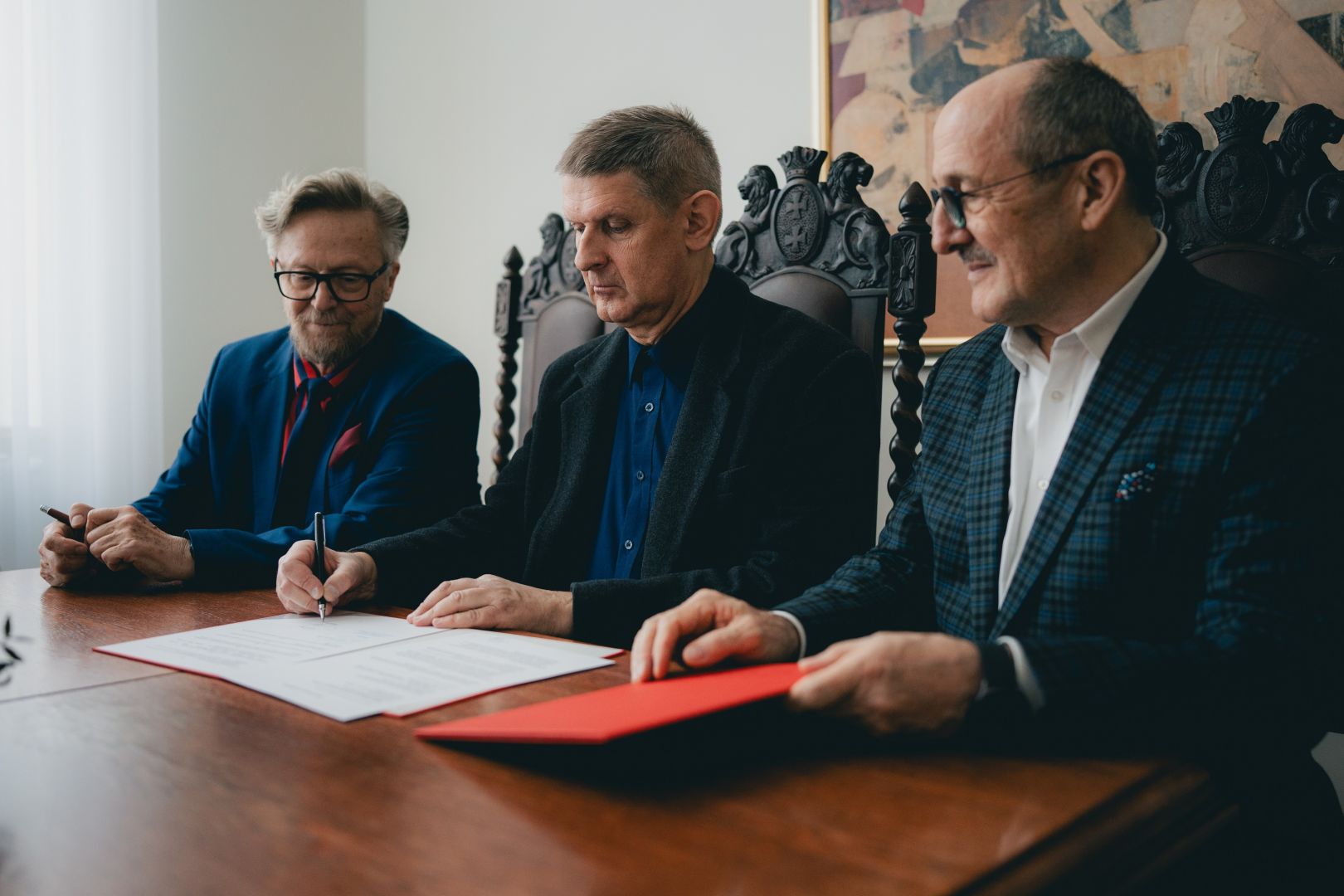 Uroczyste podpisanie porozumienia miało miejsce w poniedziałek 14 kwietnia 2025 r. w Gabinecie Rektora aMuz. Ze strony naszej uczelni podpis złożył Rektor aMuz prof. dr hab. Ryszard Minkiewicz, zaś ze strony Stowarzyszenia – Georgis Bogdanis – Wiceprzewodniczący – Członek Prezydium, oraz prof. Marek Skowronek – Członek Zarządu, redaktor Radia Danielka.