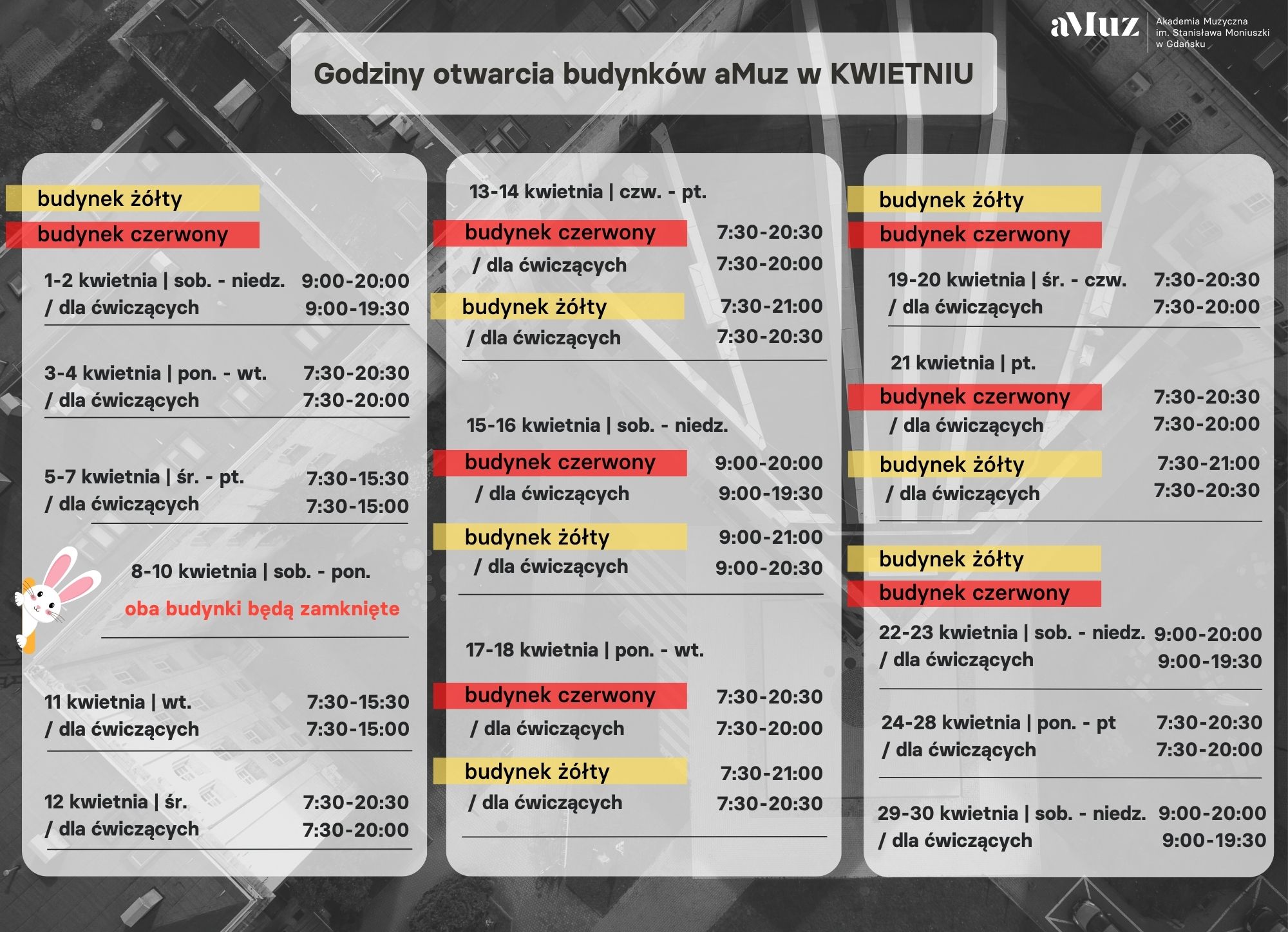 Godziny otwarcia budynków aMuz w kwietniu 2023