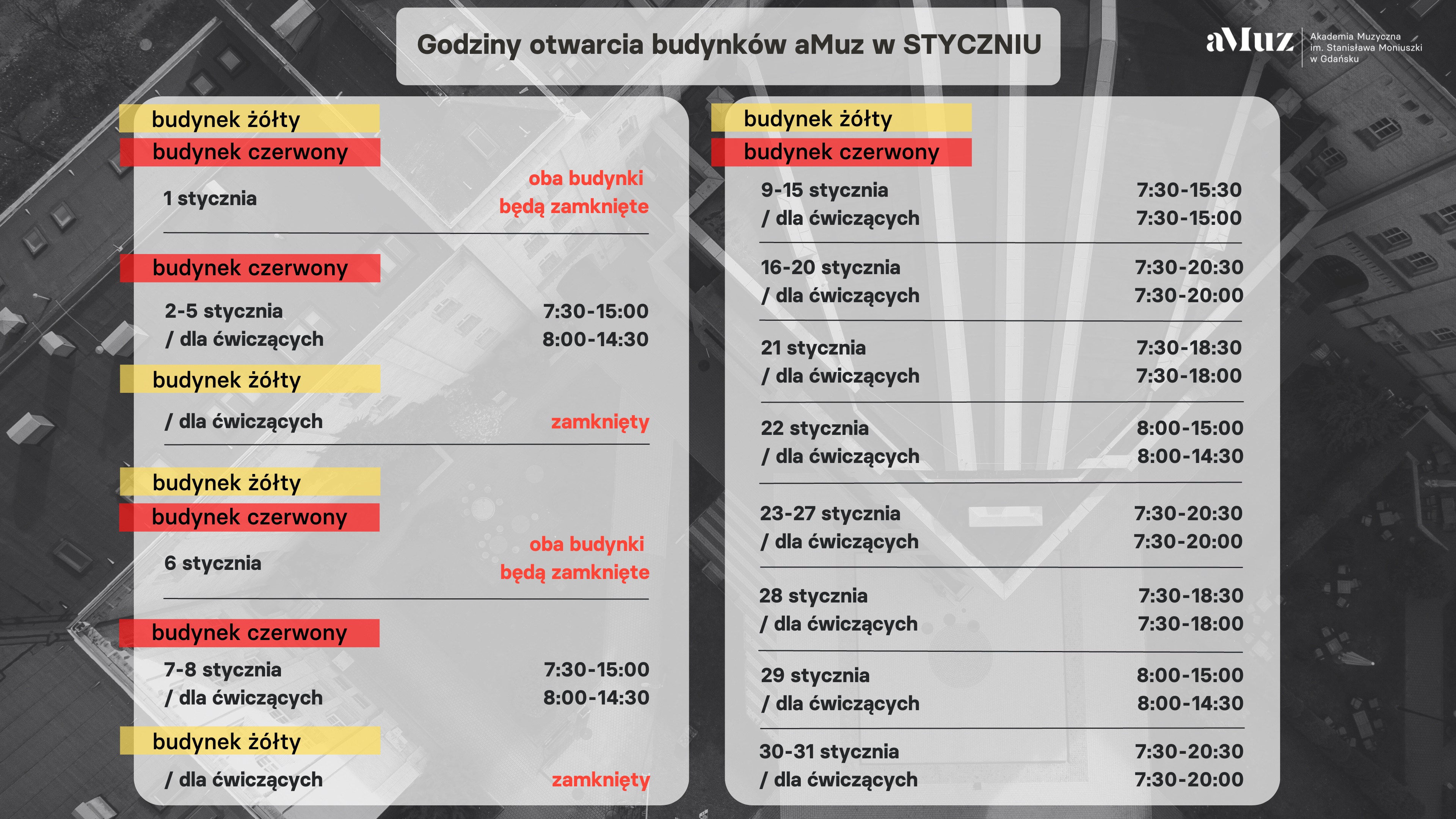 Godziny otwarcia budynków aMuz w styczniu 2023