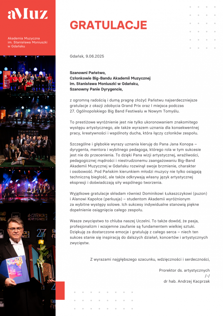 Szczególne gratulacje kierujemy do całego zespołu, jego prowadzącego oraz wyróżnionych solistów – Dominika Łukaszczyka i Alana Kapołki – za ten znakomity sukces, który jest powodem do dumy dla całej społeczności aMuz. To kolejny dowód na to, że młodzi artyści naszej Uczelni – wspierani przez inspirujących pedagogów – z pasją i profesjonalizmem budują swoją artystyczną tożsamość oraz silnie zaznaczają swoją obecność na krajowej scenie jazzowej.