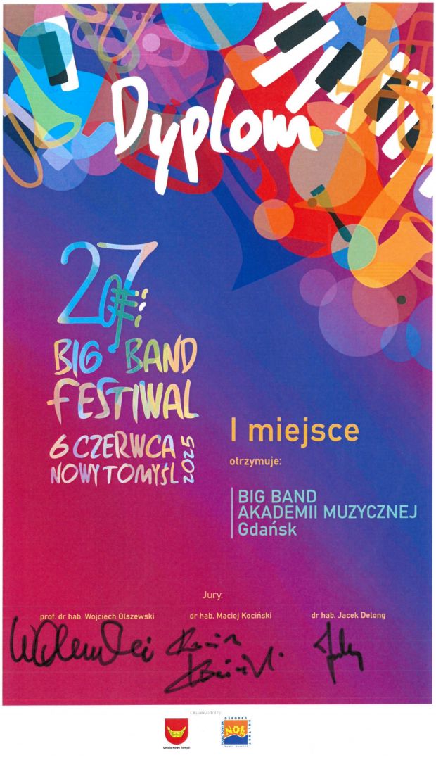 Z wielką radością informujemy, że Big-Band Akademii Muzycznej im. Stanisława Moniuszki w Gdańsku pod kier. Jana Konopa zdobył GRAND PRIX oraz I NAGRODĘ podczas prestiżowego 27. Ogólnopolskiego Big Band Festiwalu w Nowym Tomyślu, który odbył się w dniu 6 czerwca 2025 roku.